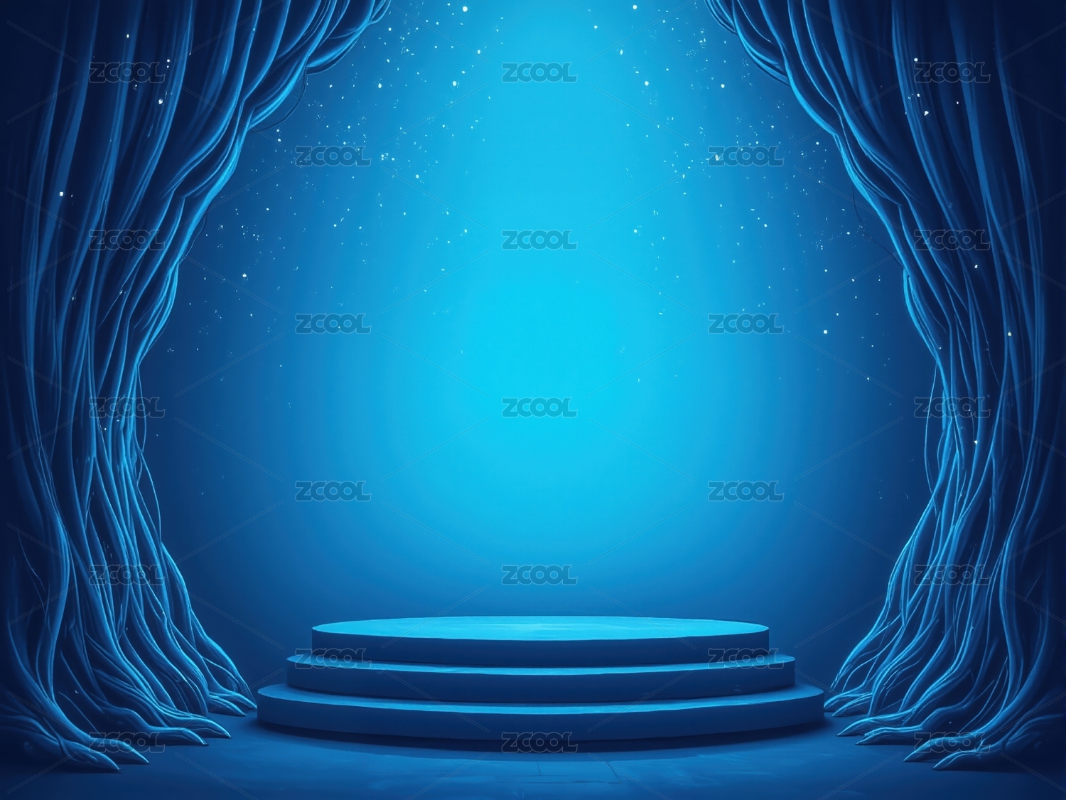 星星和窗帘装饰的空舞台,蓝色紫色梦幻背景