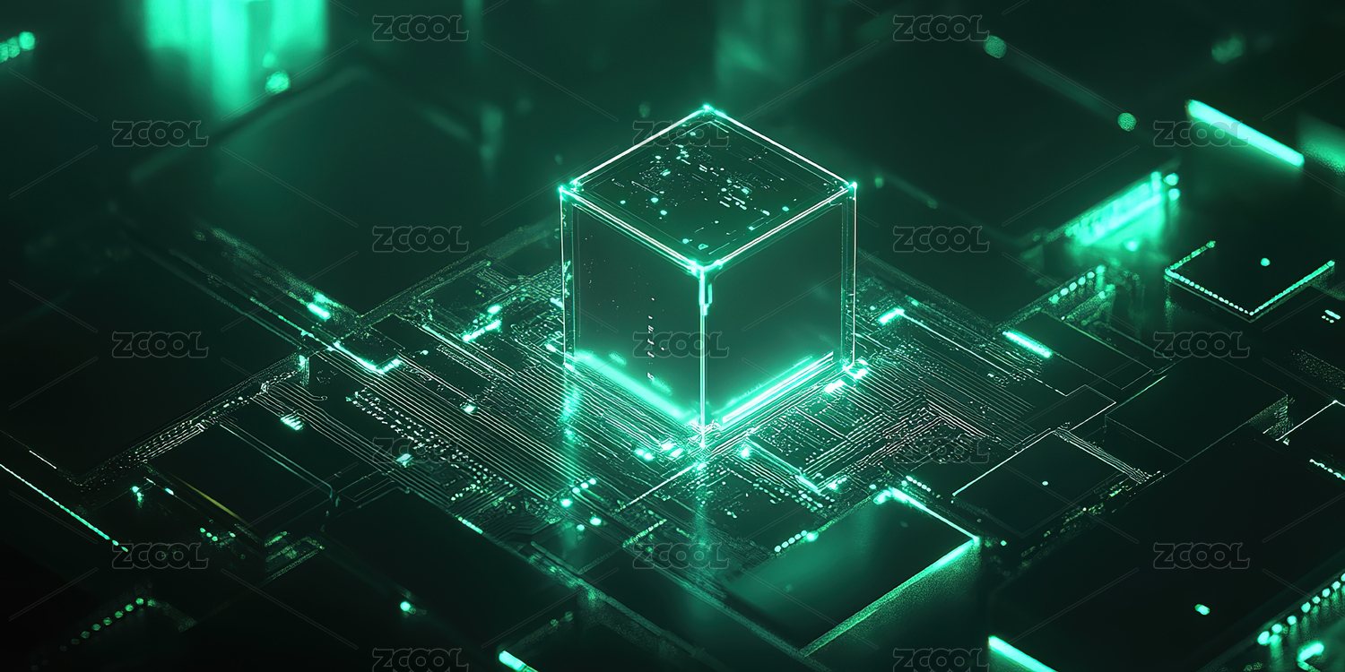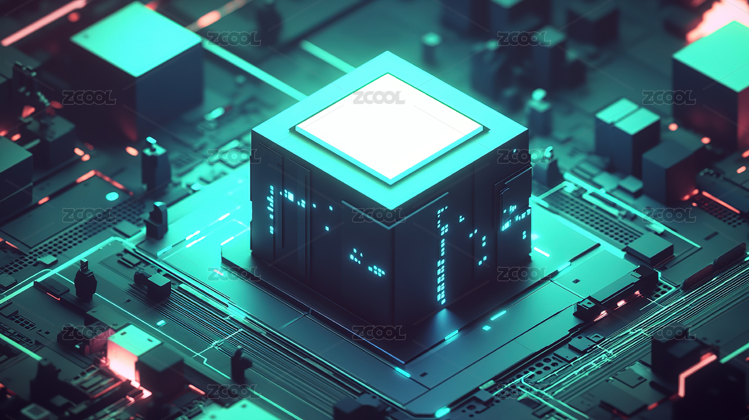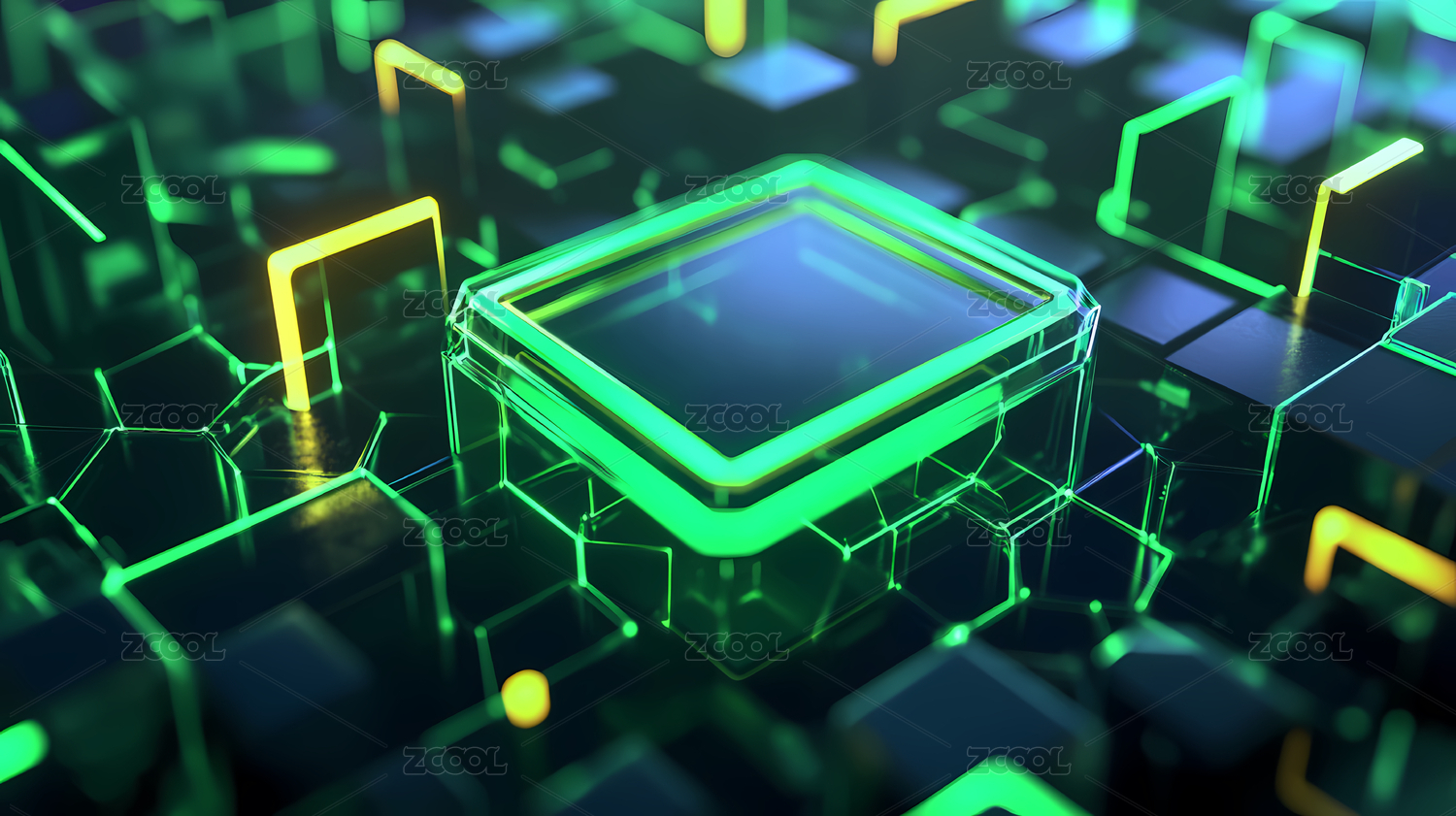 发光,芯片,电路板,科技,电子,设备,绿色,未来,立方体,圆形光环