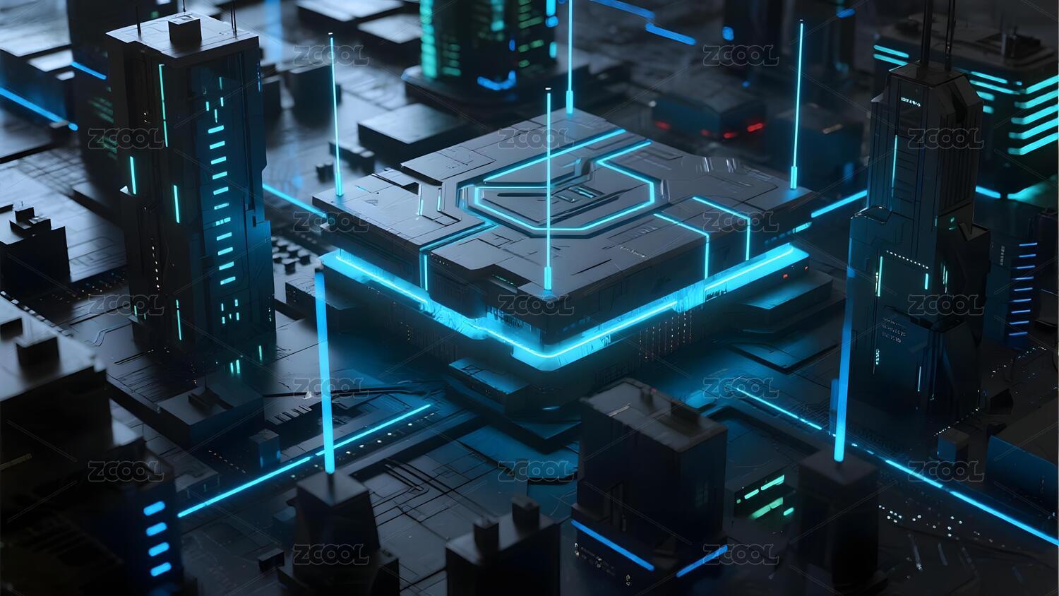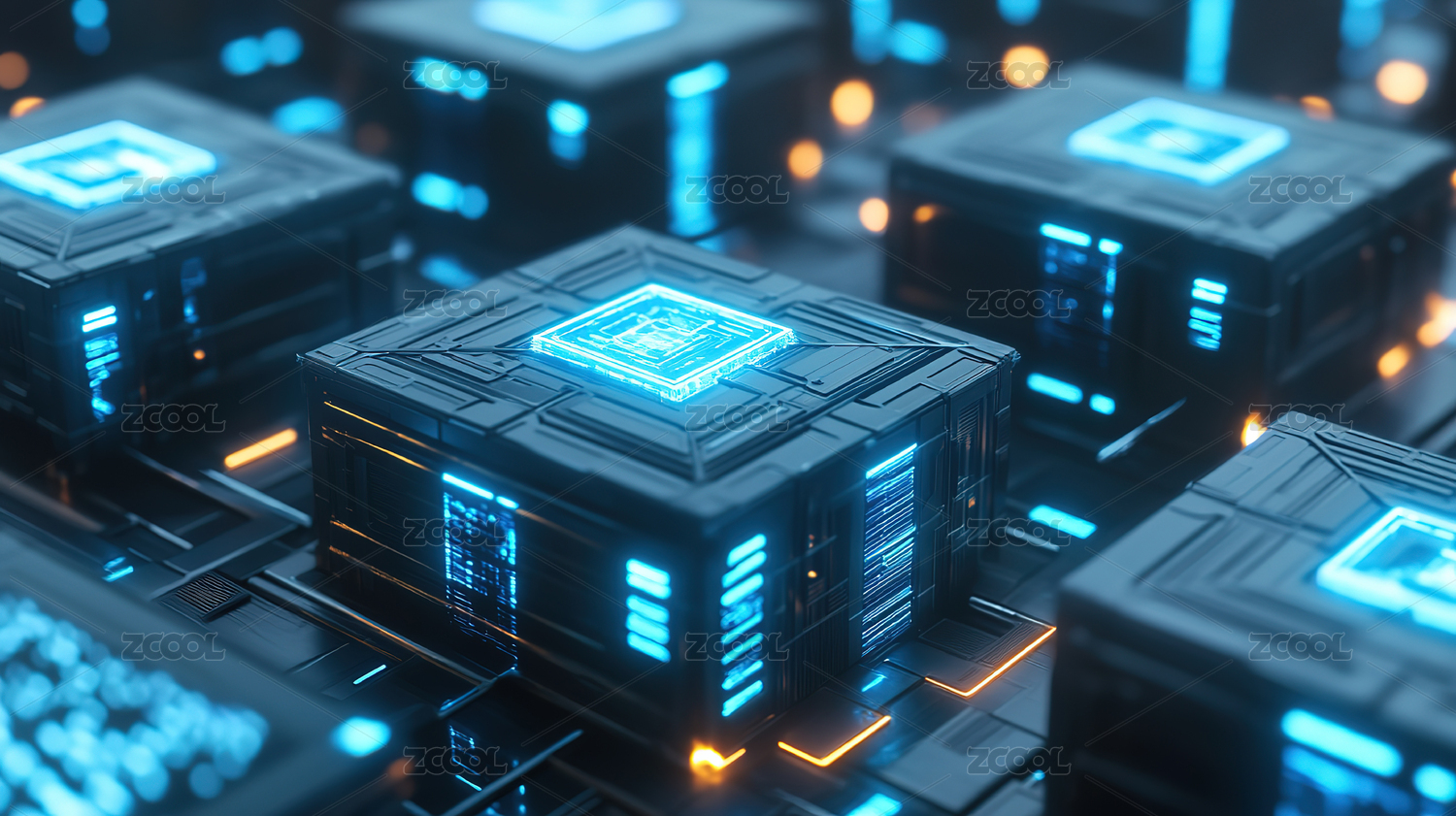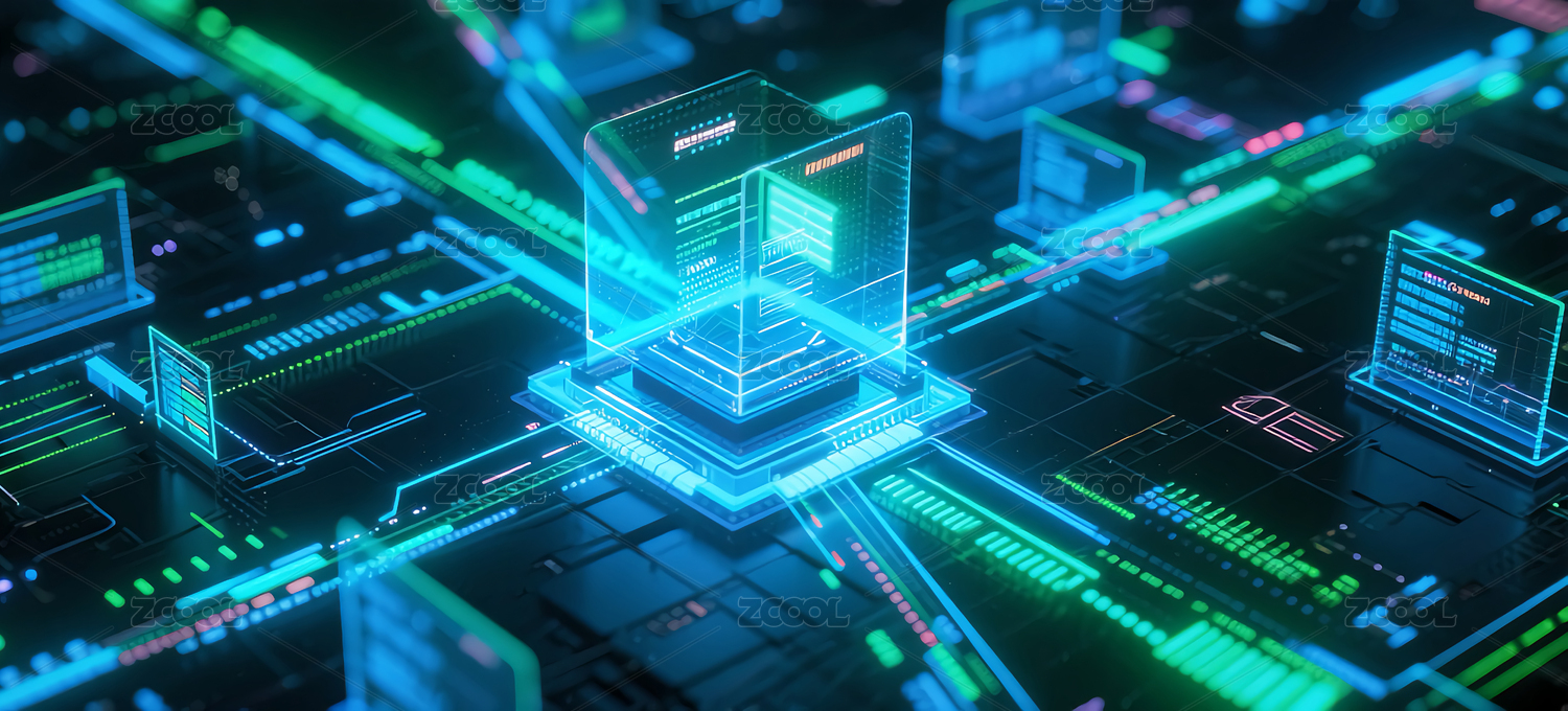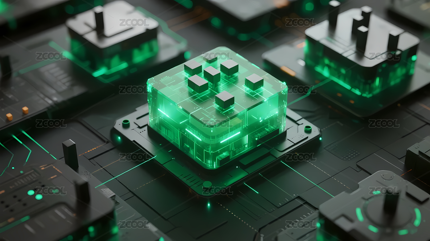 发光,芯片,电路板,科技,电子,设备,绿色,未来,立方体,圆形光环