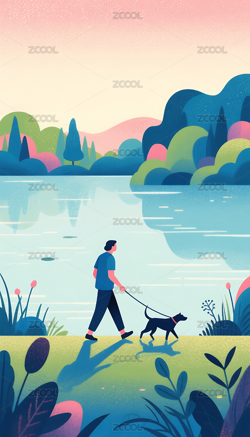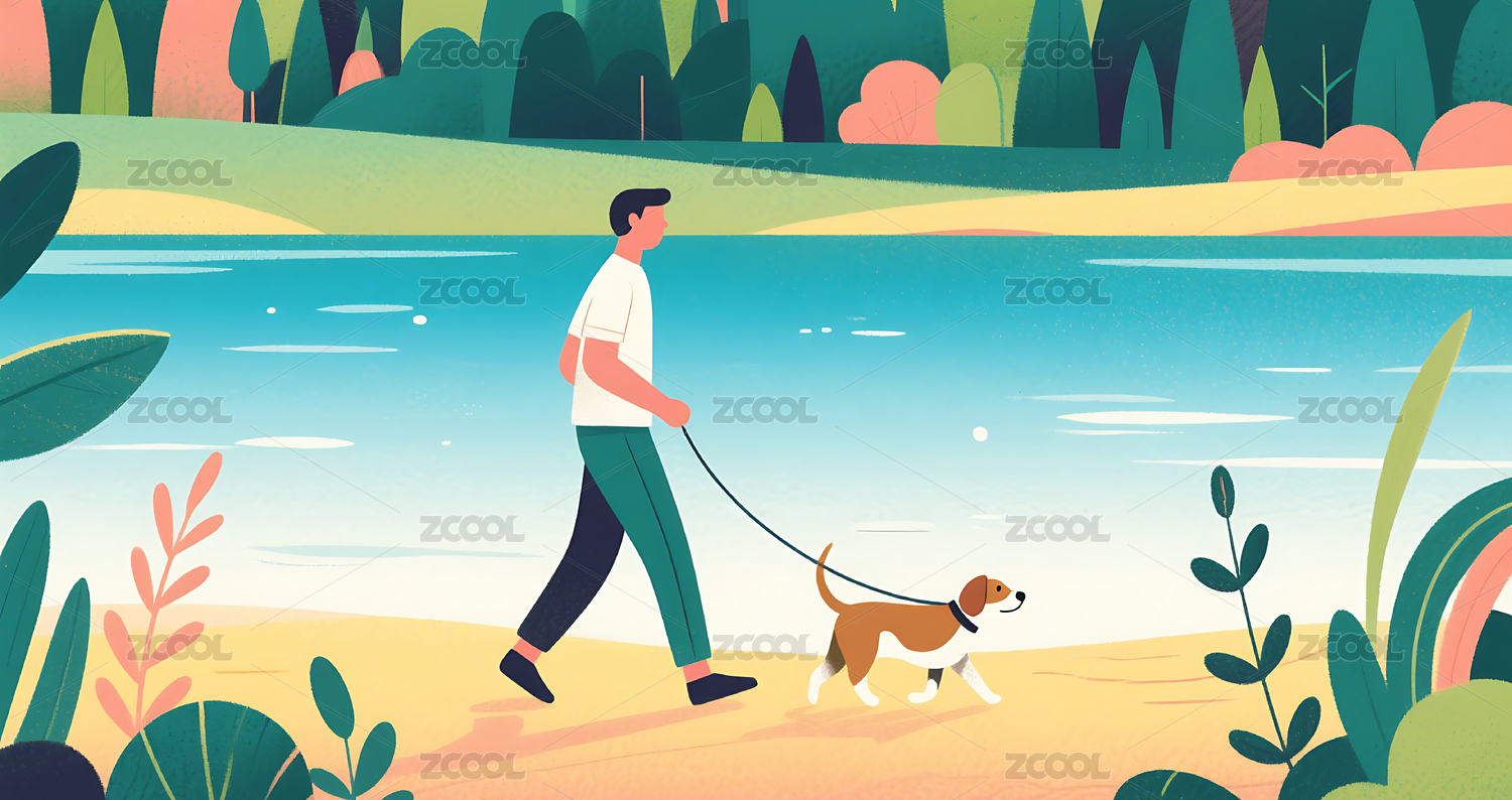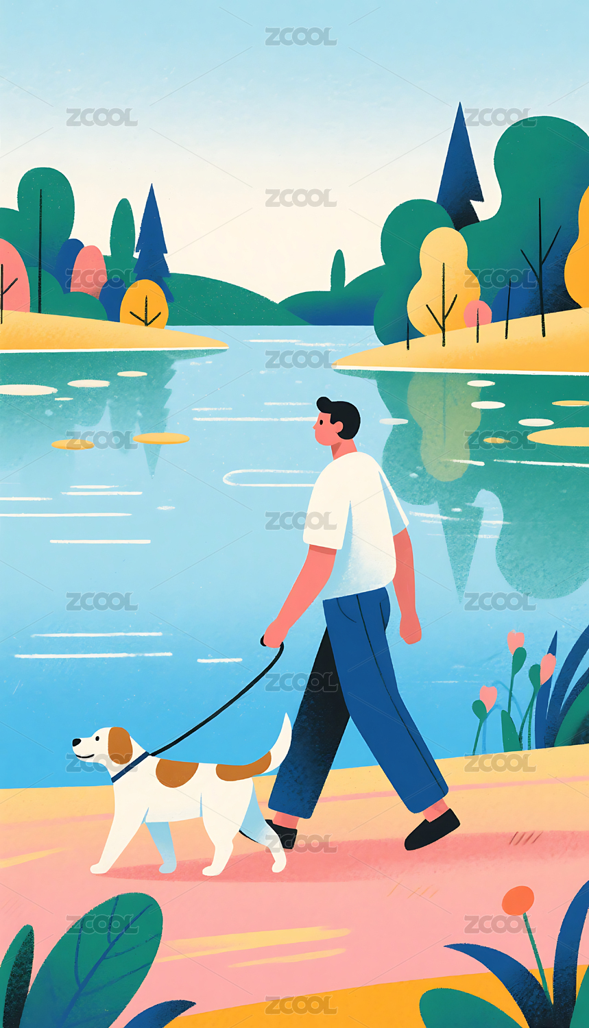 男人湖边遛狗卡通