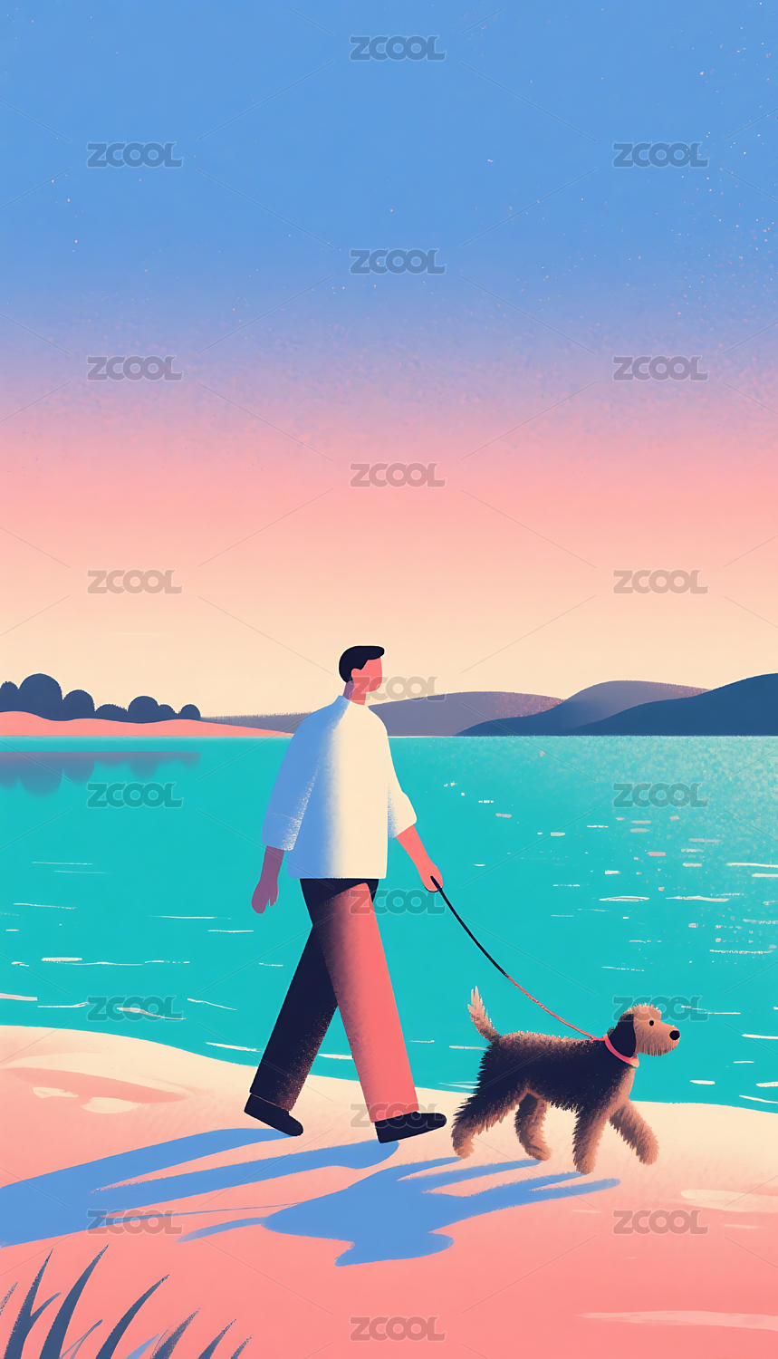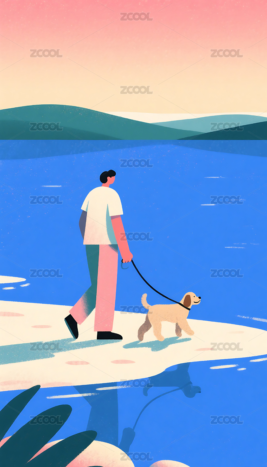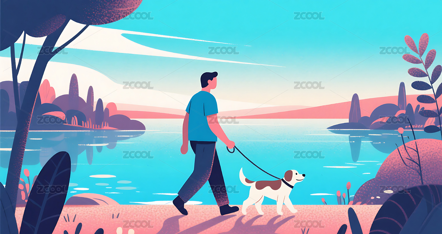 男人湖边遛狗卡通