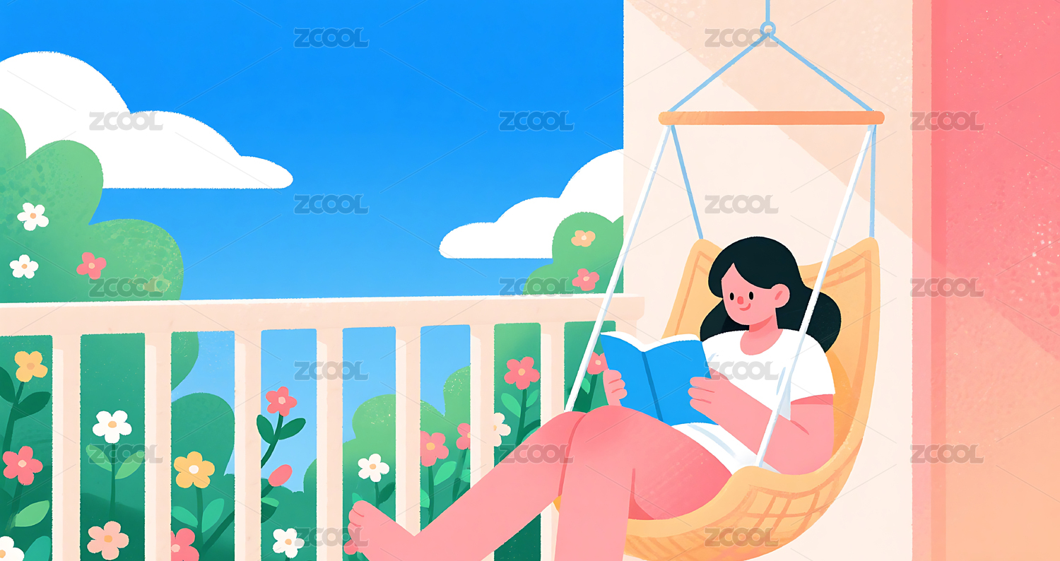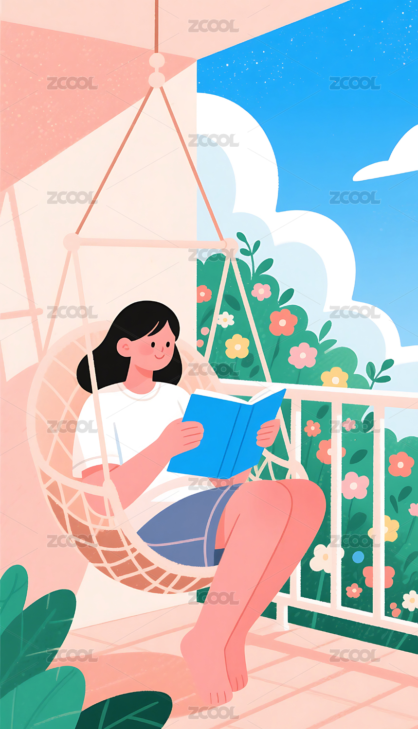 女孩在阳台吊椅上看书插画