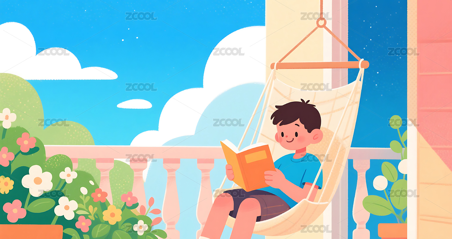 男孩躺在阳台吊床上看书卡通