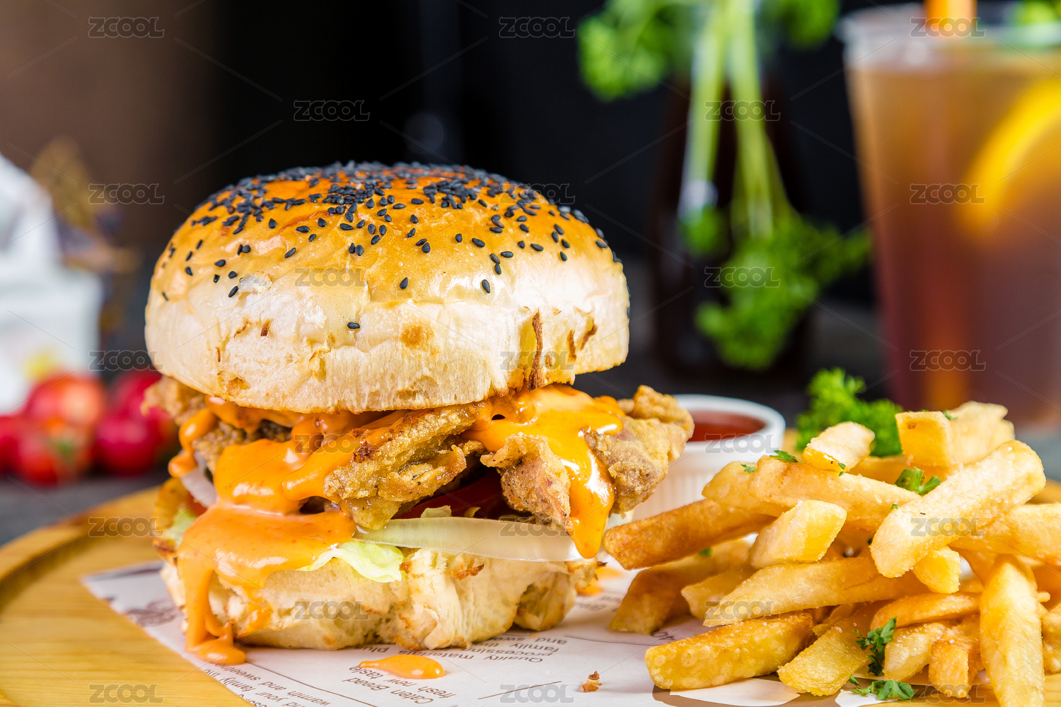 照烧鸡肉汉堡配薯条