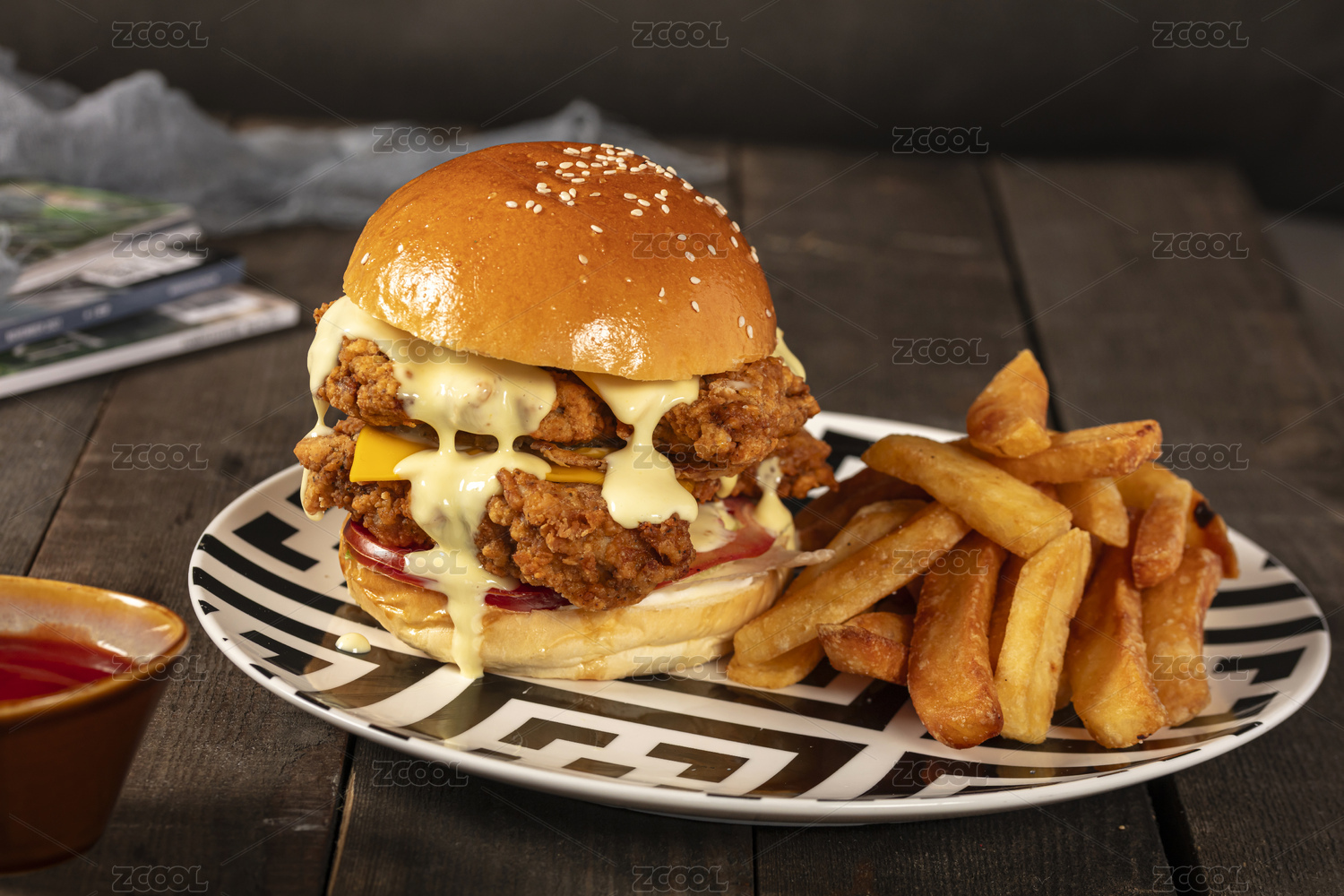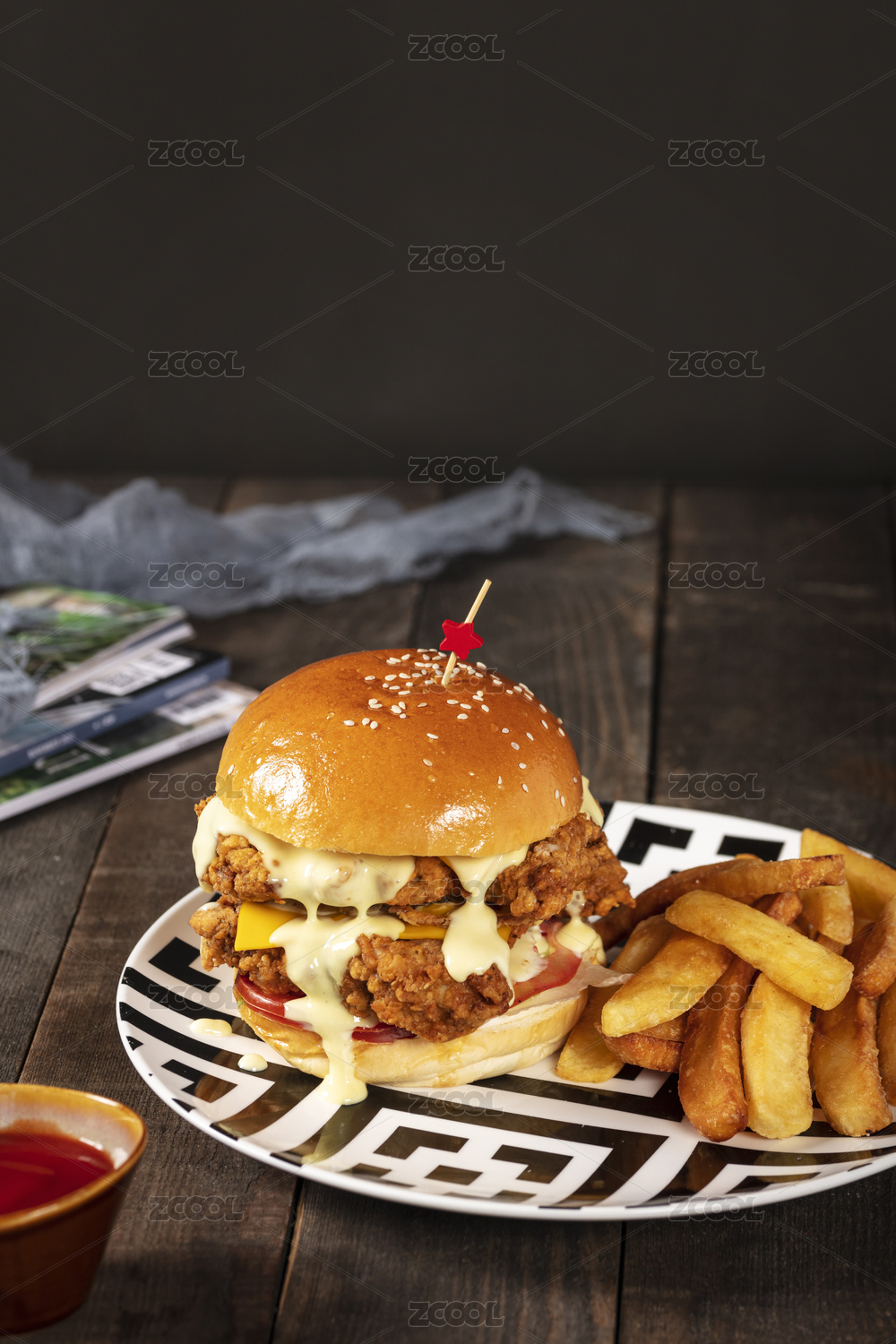 照烧鸡肉汉堡配薯条