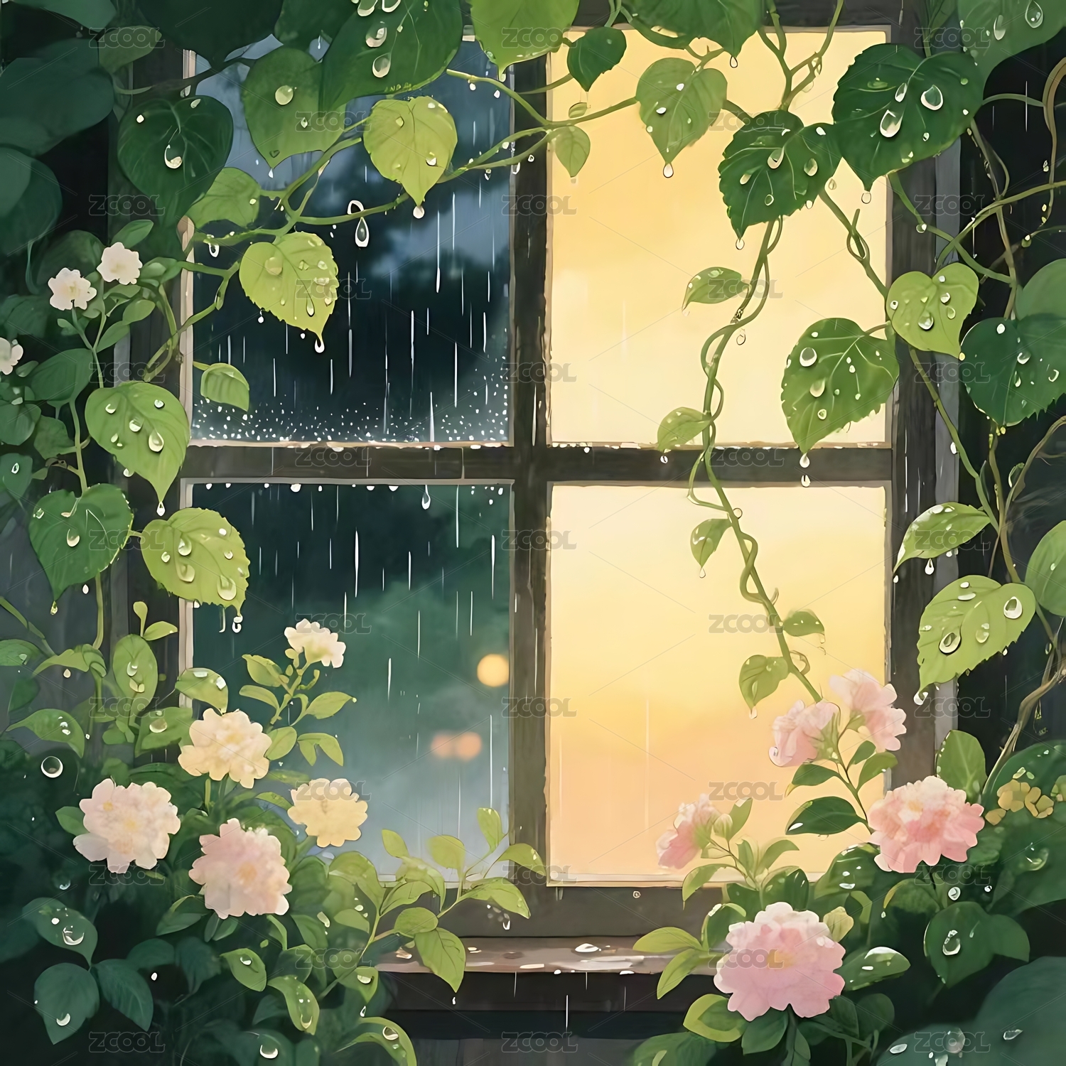雨窗,藤蔓,水滴,昏黄,暮色,繁花,绿意,静谧,朦胧,湿润