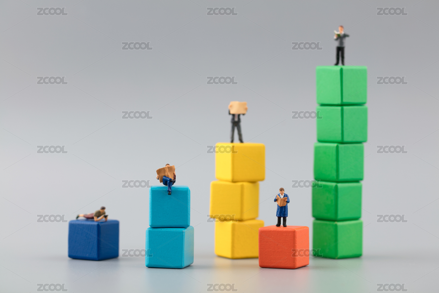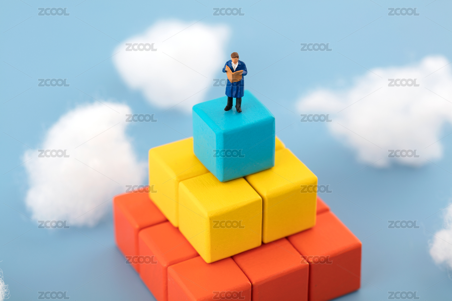 蓝色背景中站在积木上看书的男士和灯泡铅笔