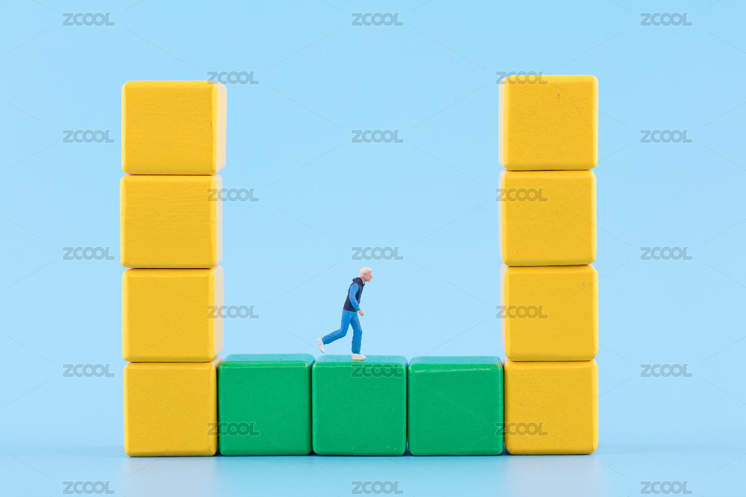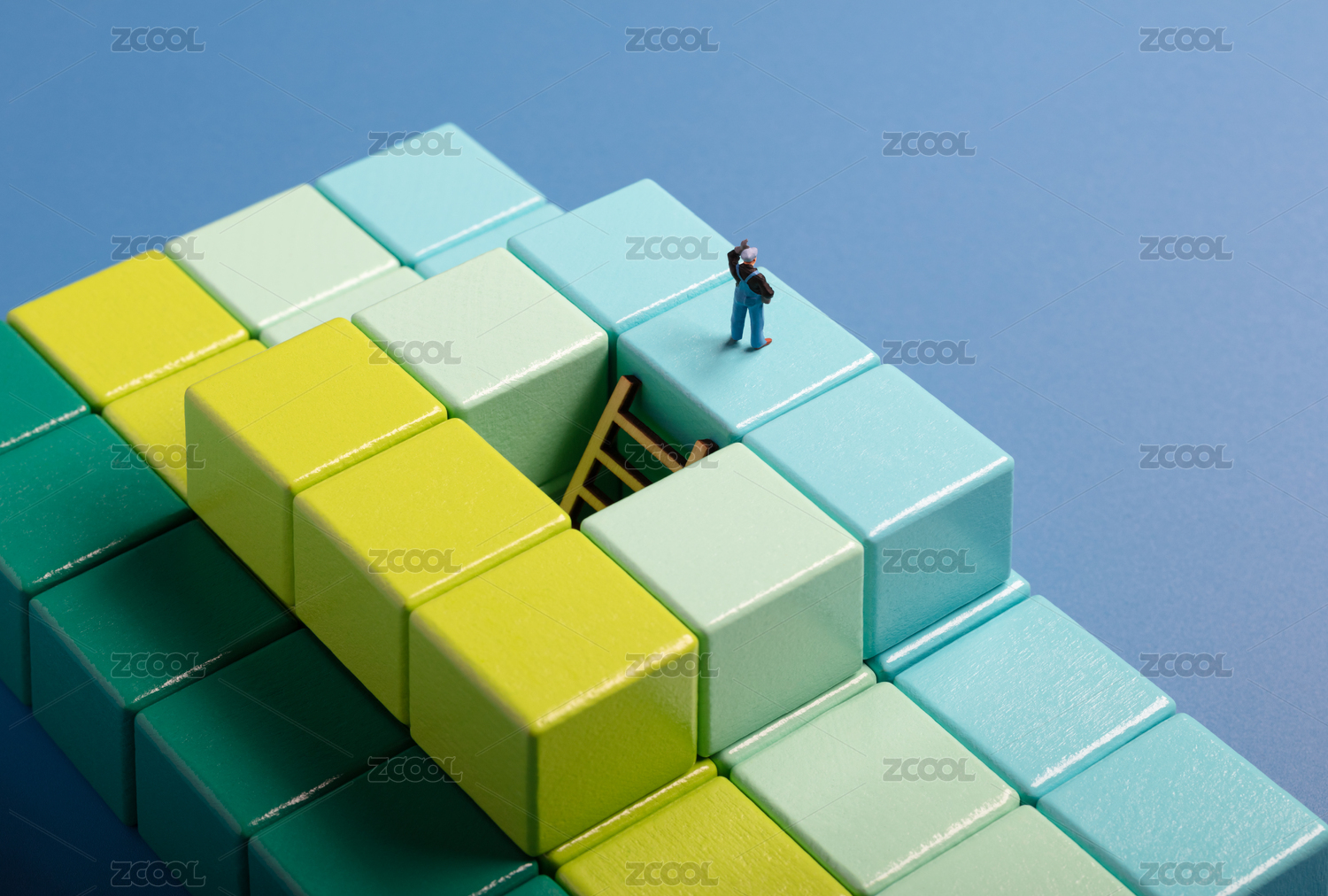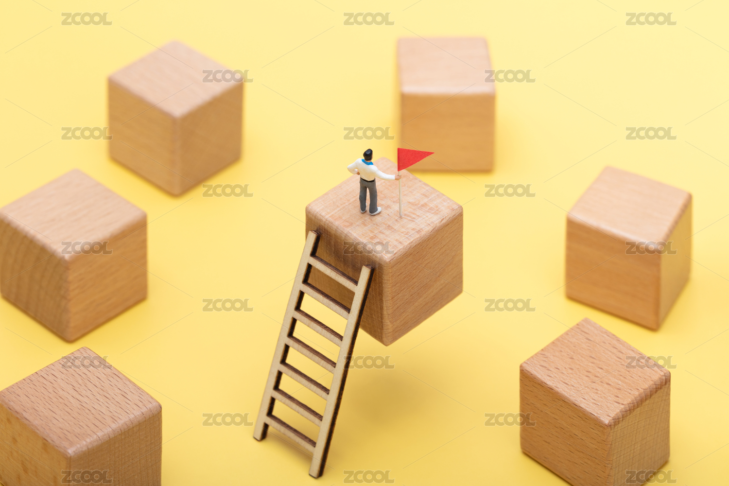 穿着西服的男士站在四周放木块爬梯的灯泡上