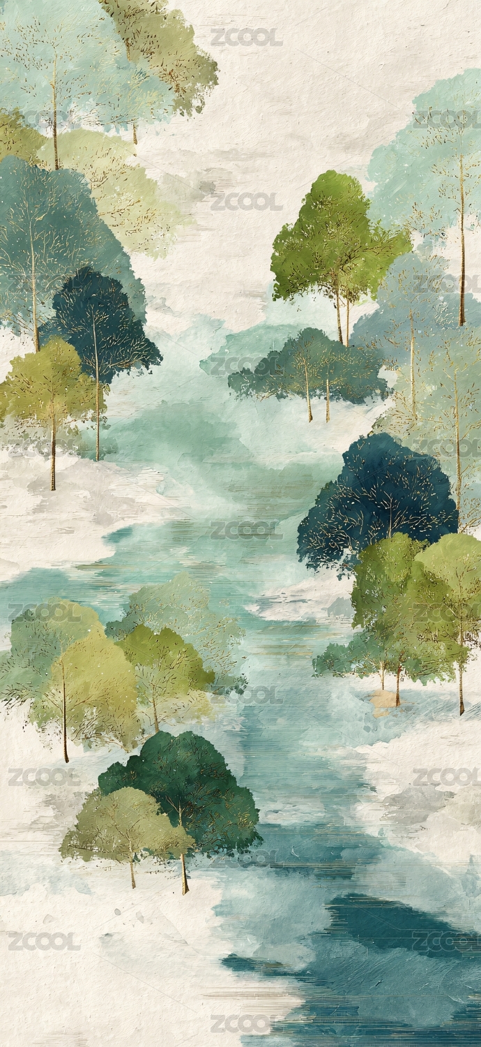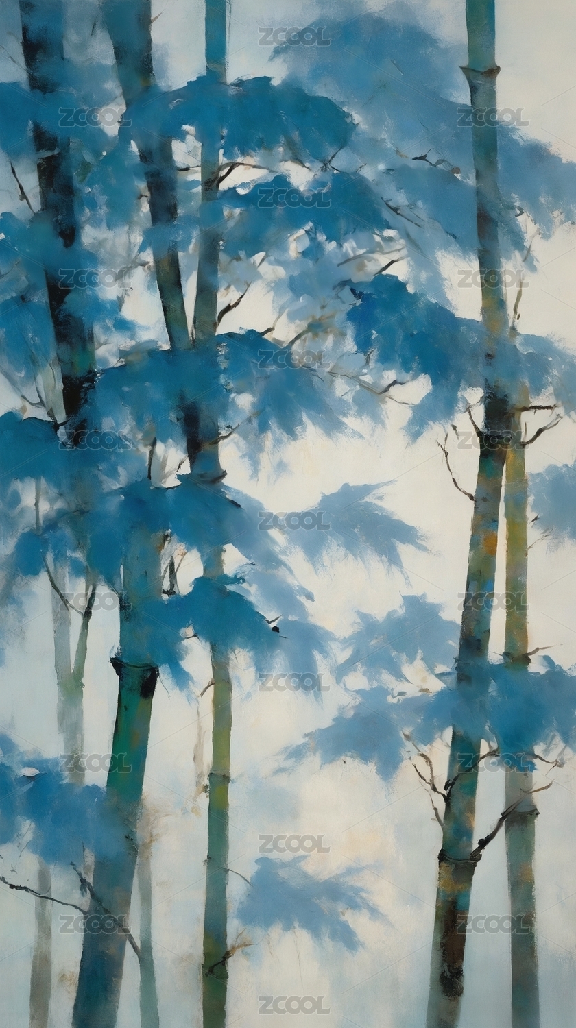 蓝绿色水墨树木抽象插画海报背景装饰画