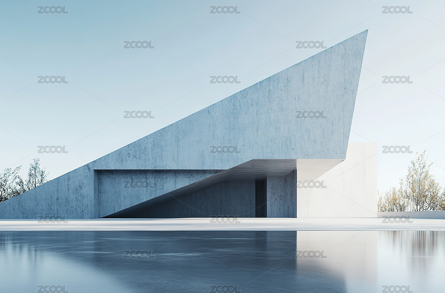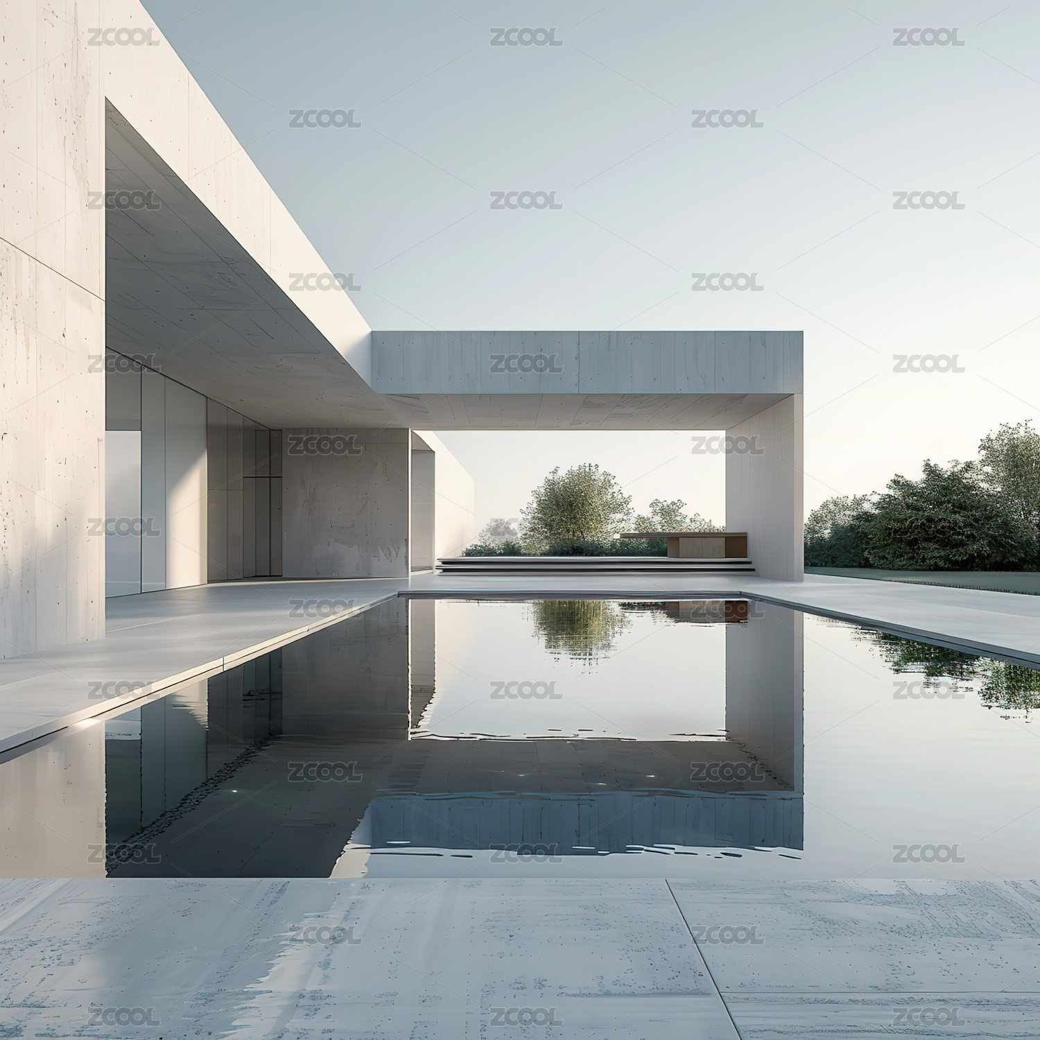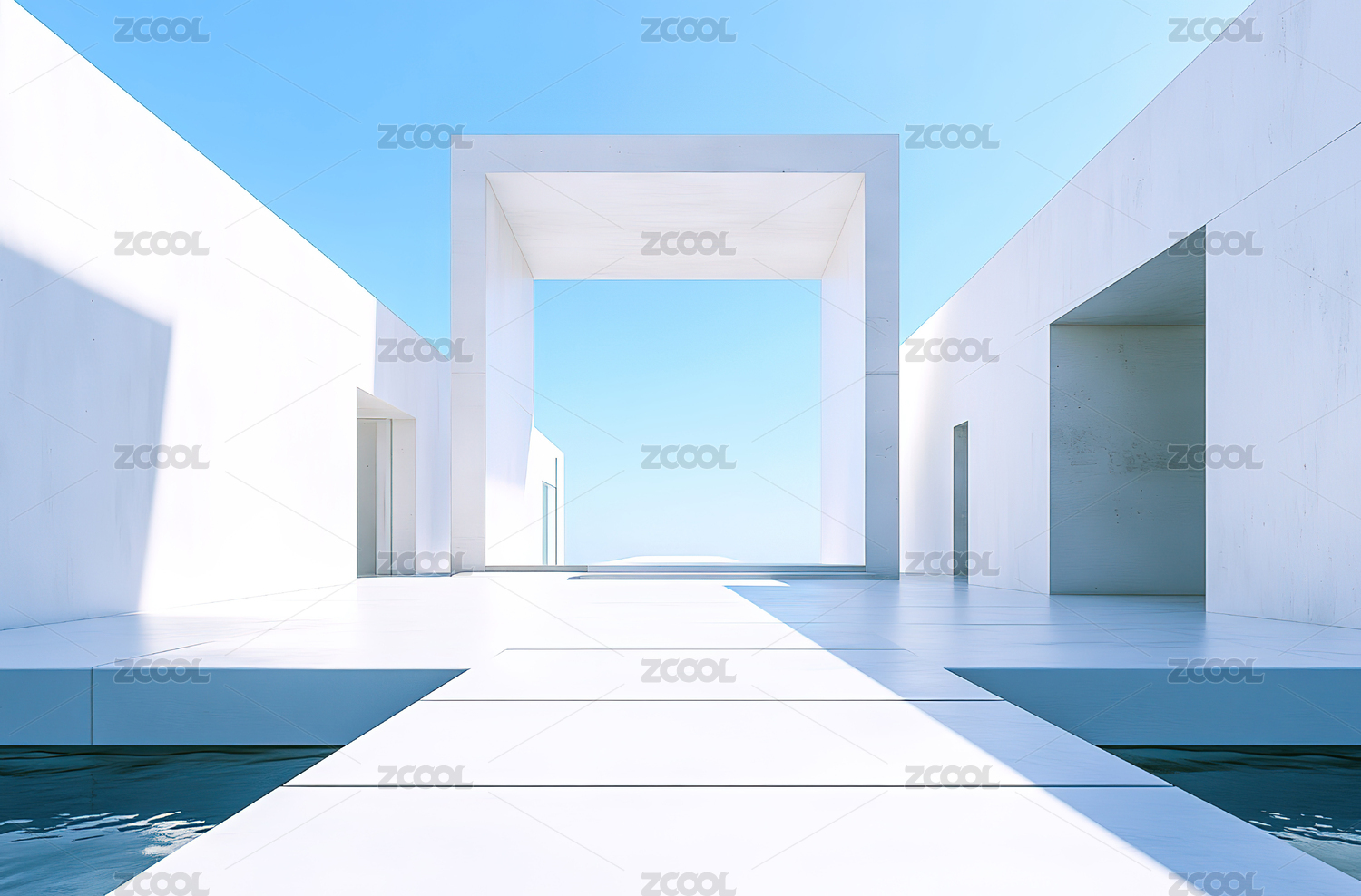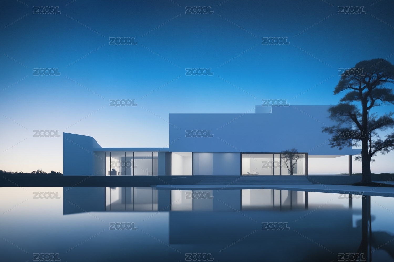 极简白色建筑与水面倒影