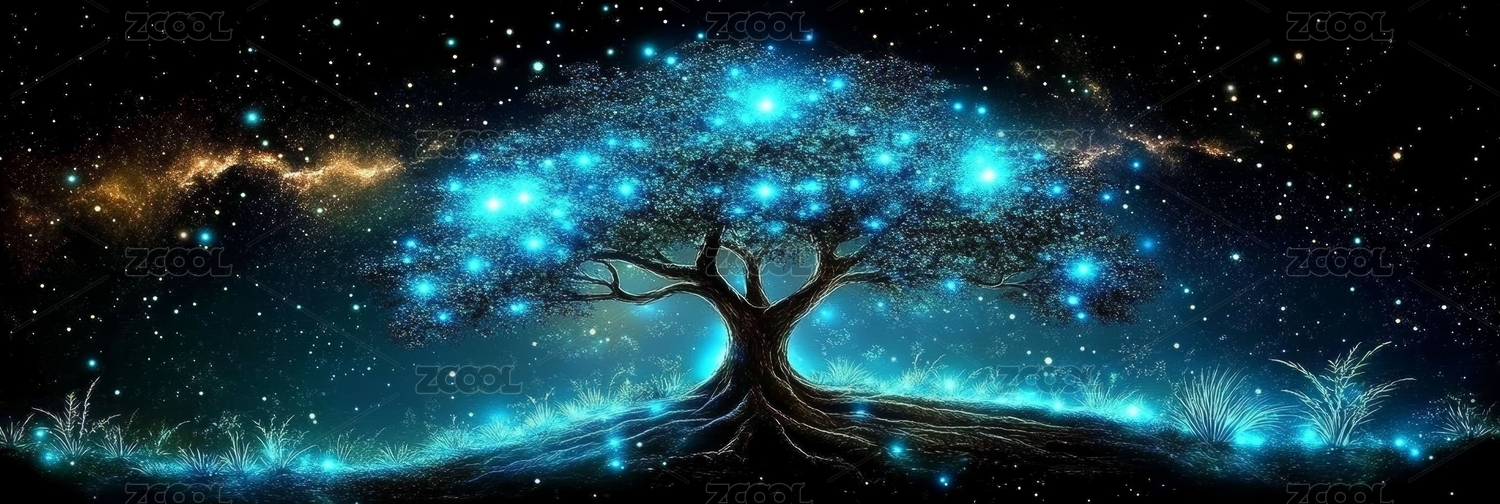 主视觉,奇幻,树,梦幻感,星空,场景,蓝色,发光,神秘,夜空