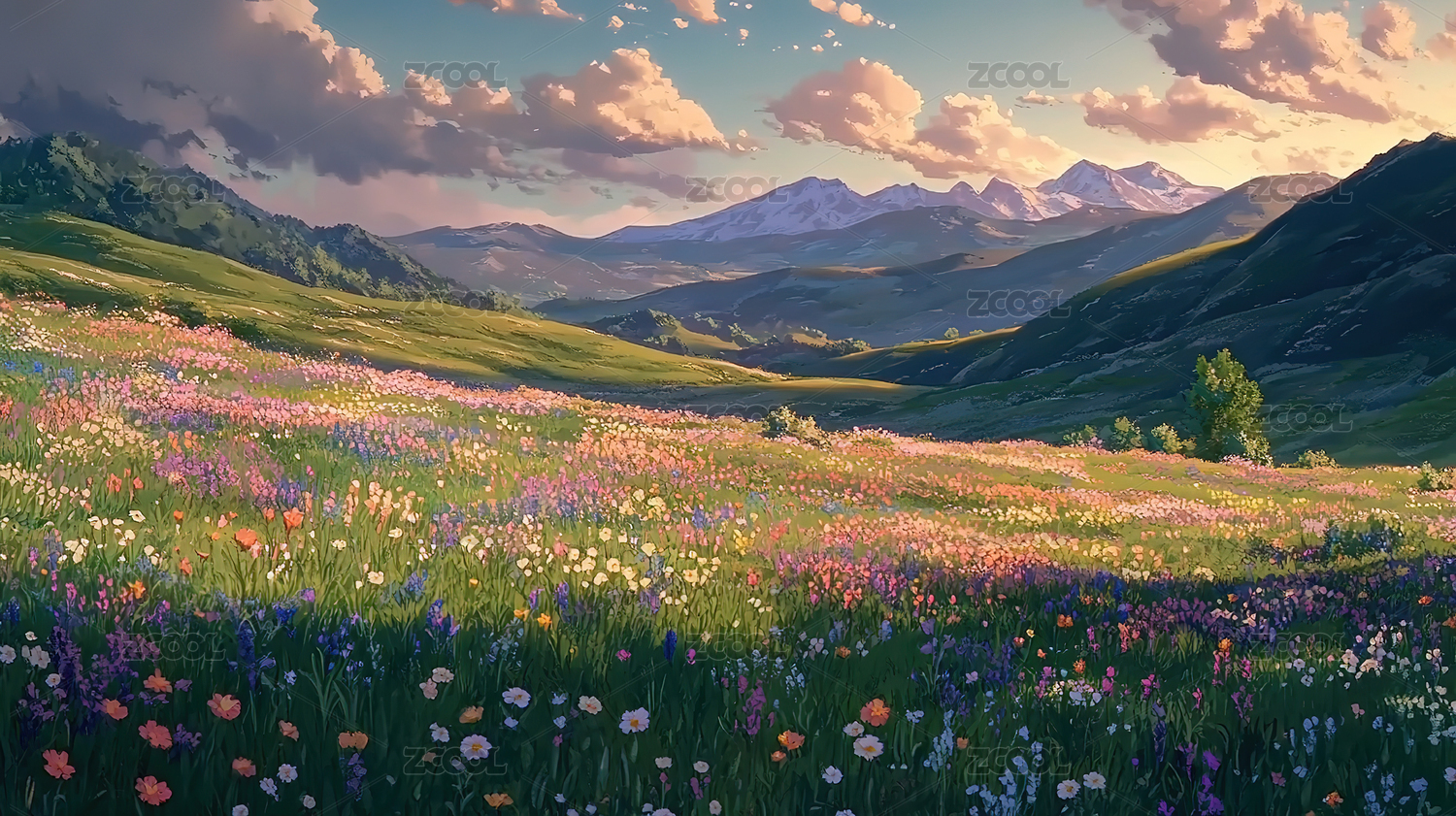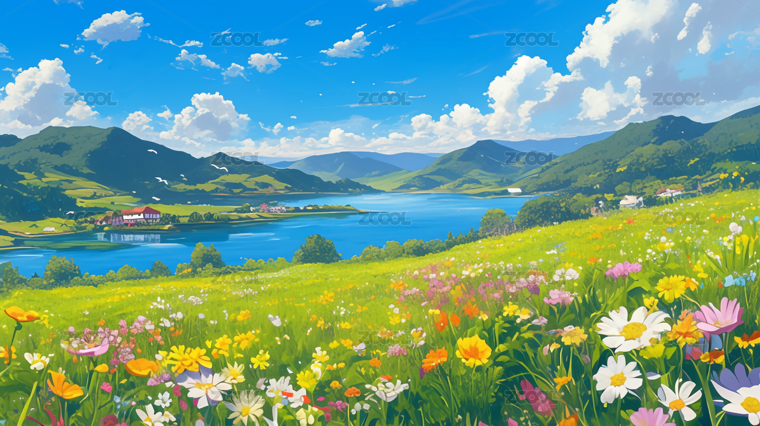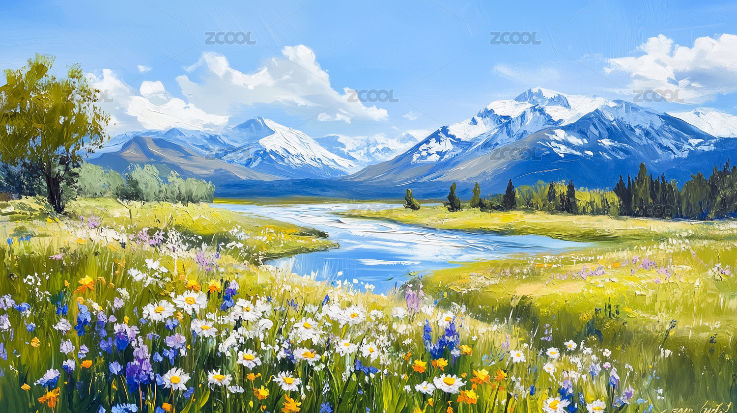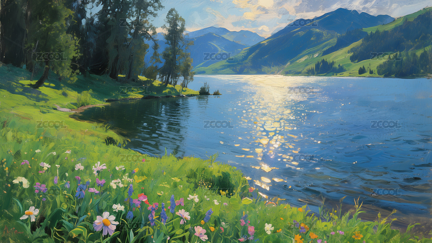 夏天,现代油画,远山,草地,树木,花朵,湖水,阳光,梦幻,唯美