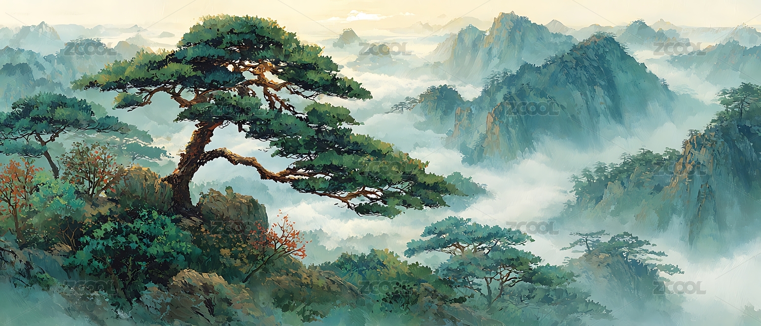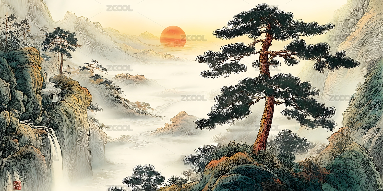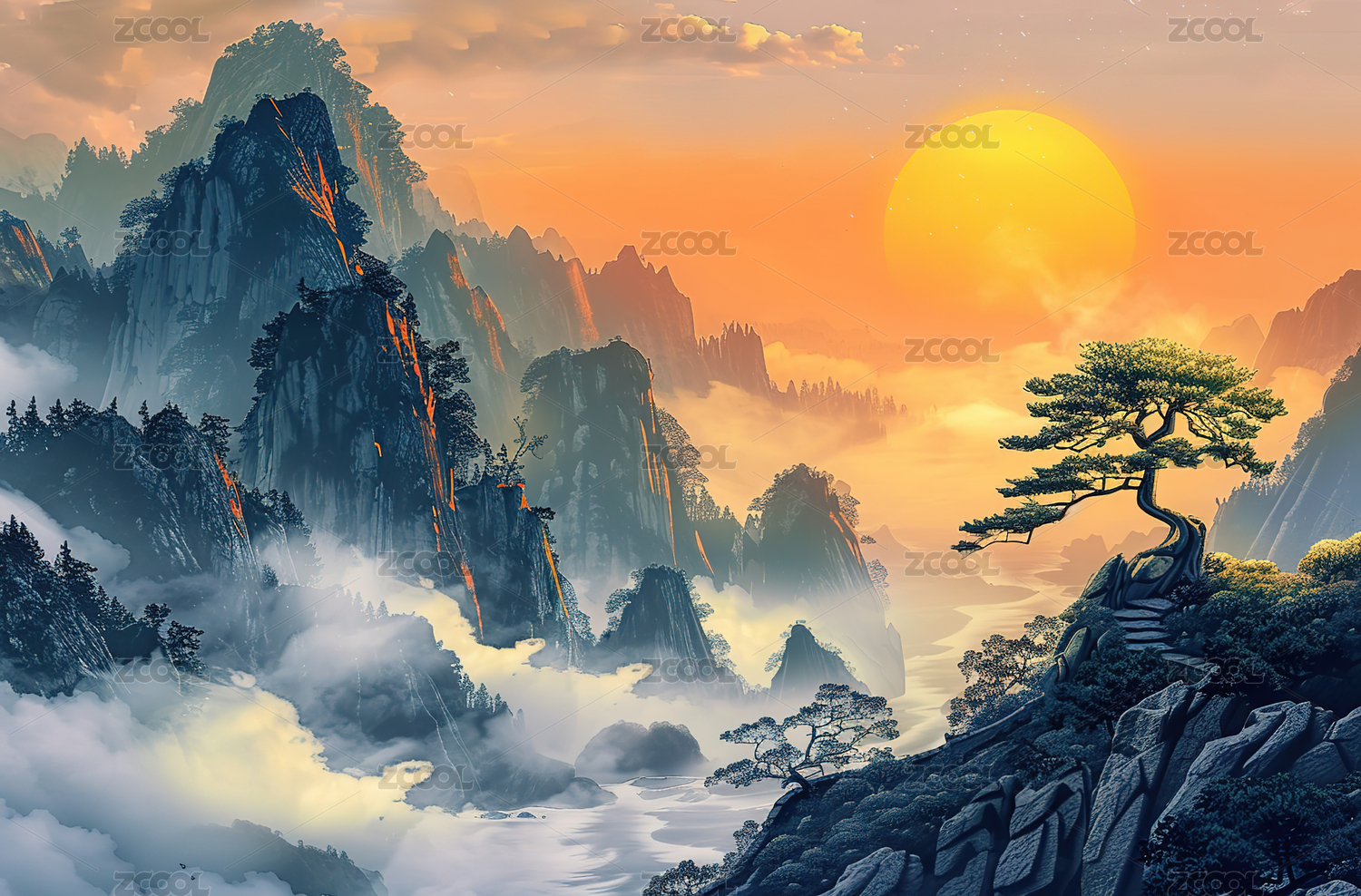 艺术,山峰,树木,云雾,意境,景色,绘画,日出,清新,东方
