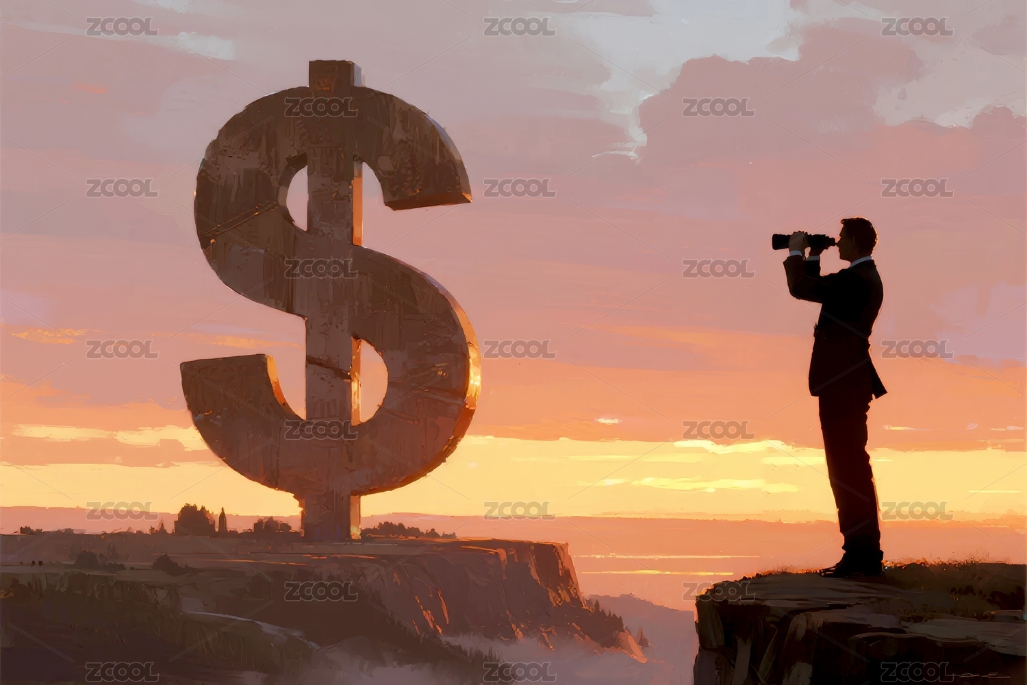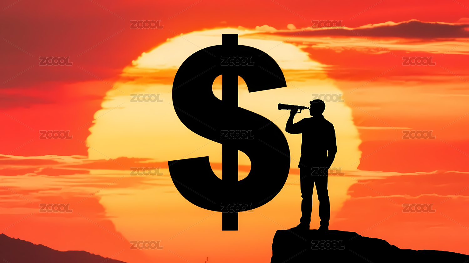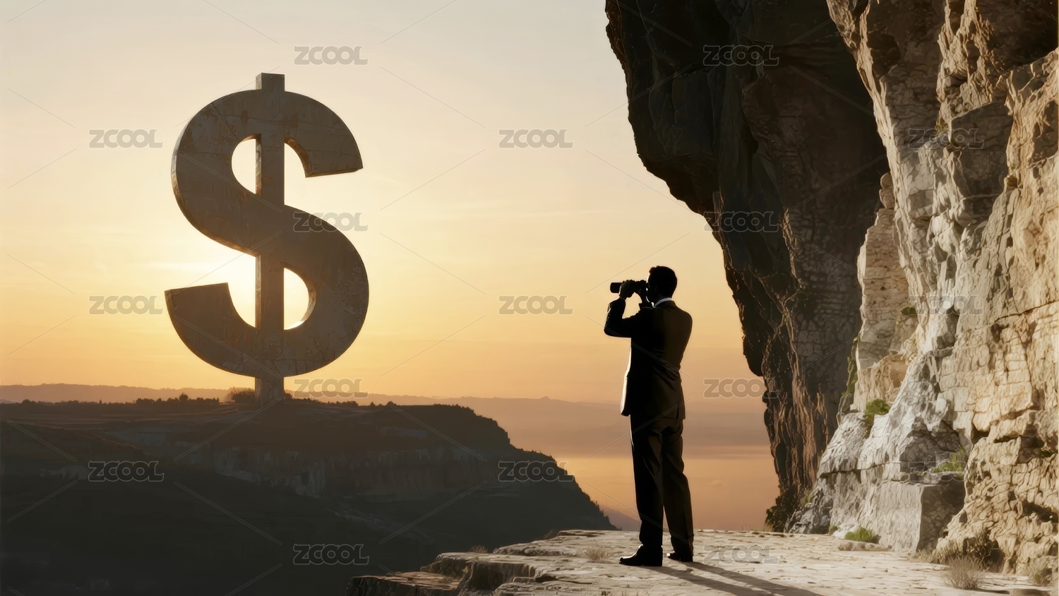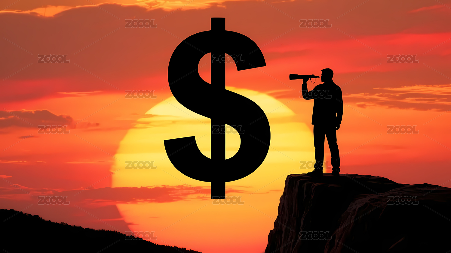 悬崖人物夕阳美元符号