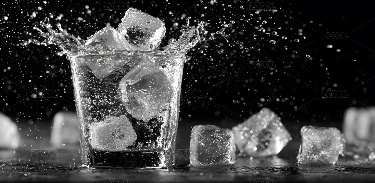 冰块饮料飞溅瞬间黑白摄影