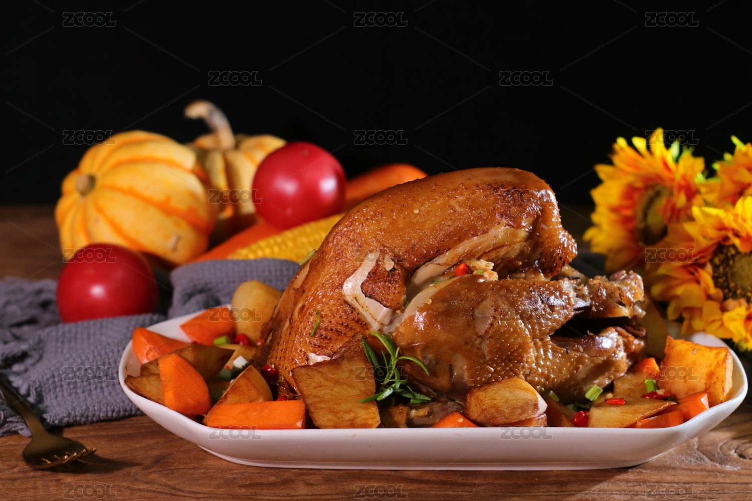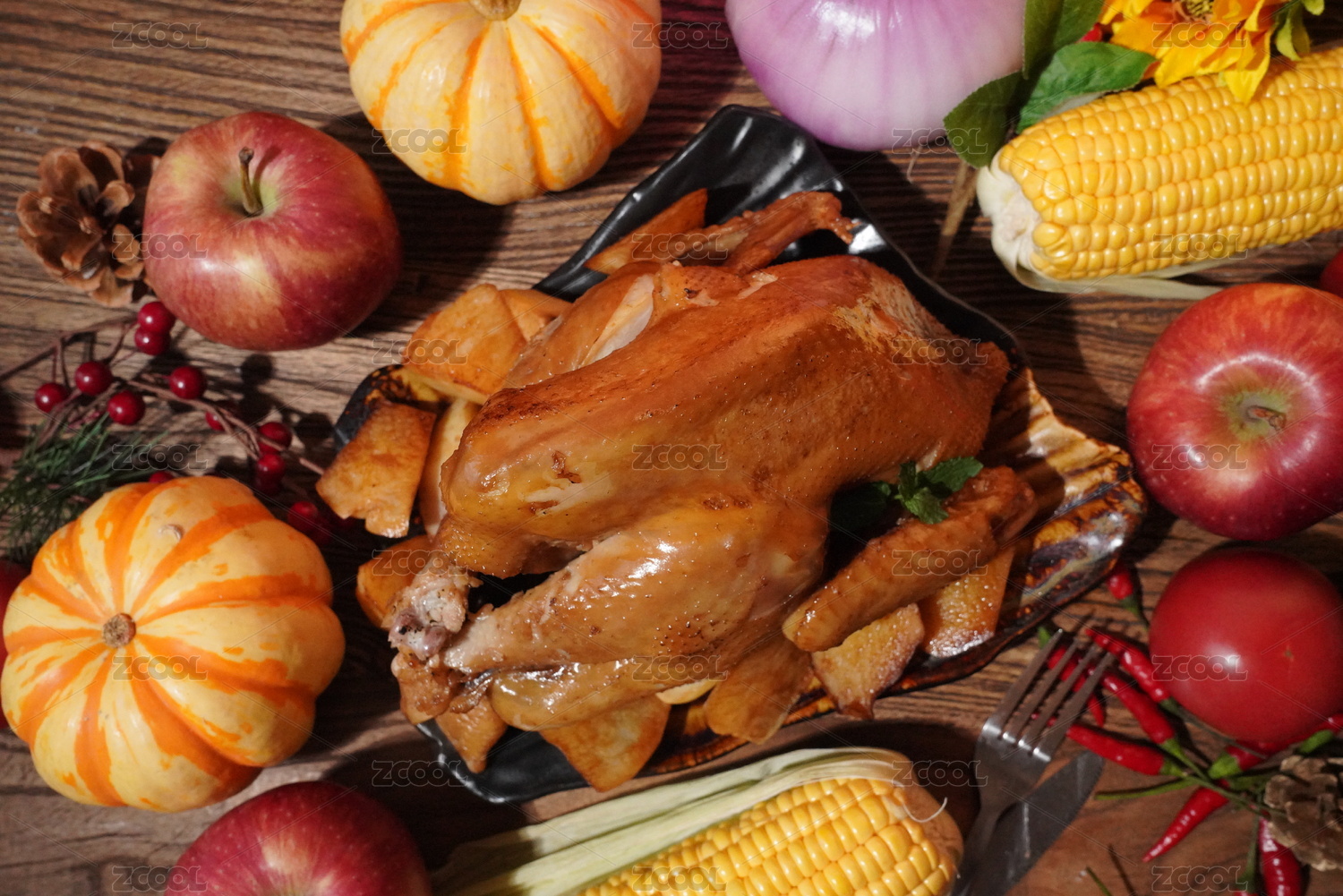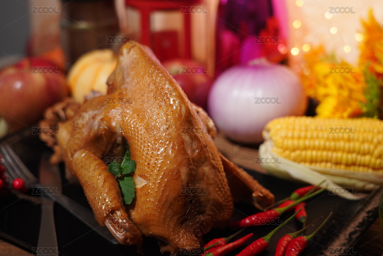 感恩节,烤鸡,鸡肉,红辣椒,洋葱,玉米,南瓜,餐具,食材,烹饪