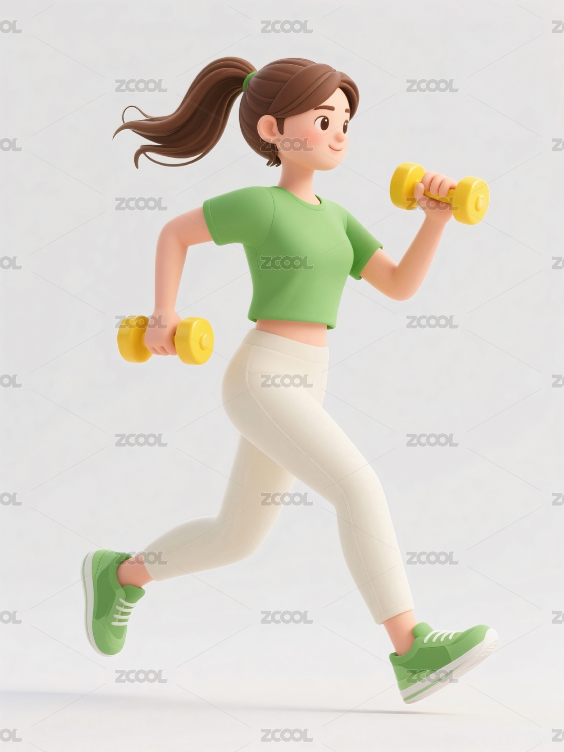 3D渲染的卡通女孩穿着绿色运动服和跑鞋在