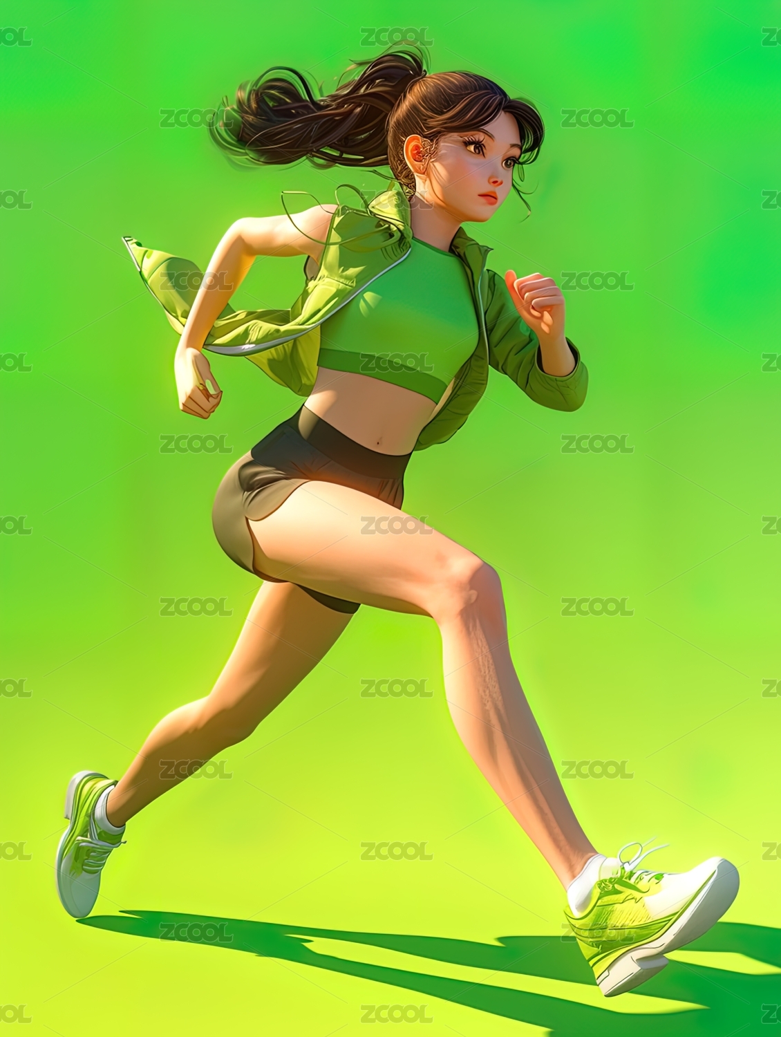 3D渲染的卡通女孩穿着绿色运动服和跑鞋