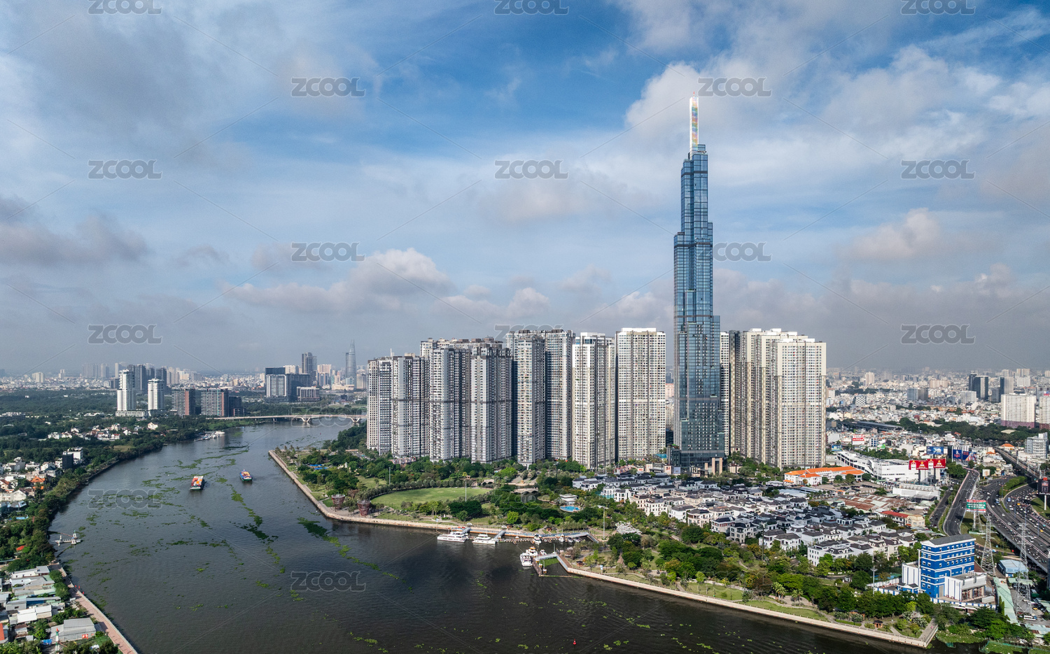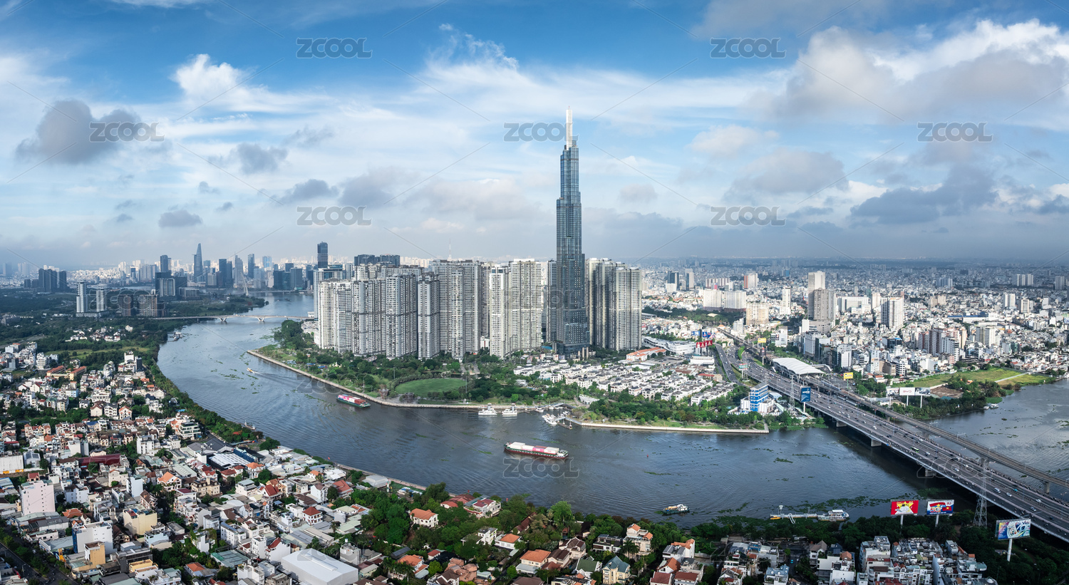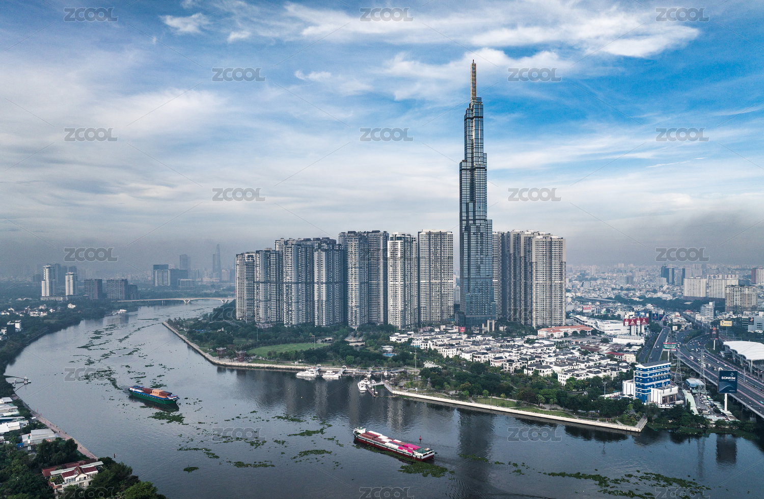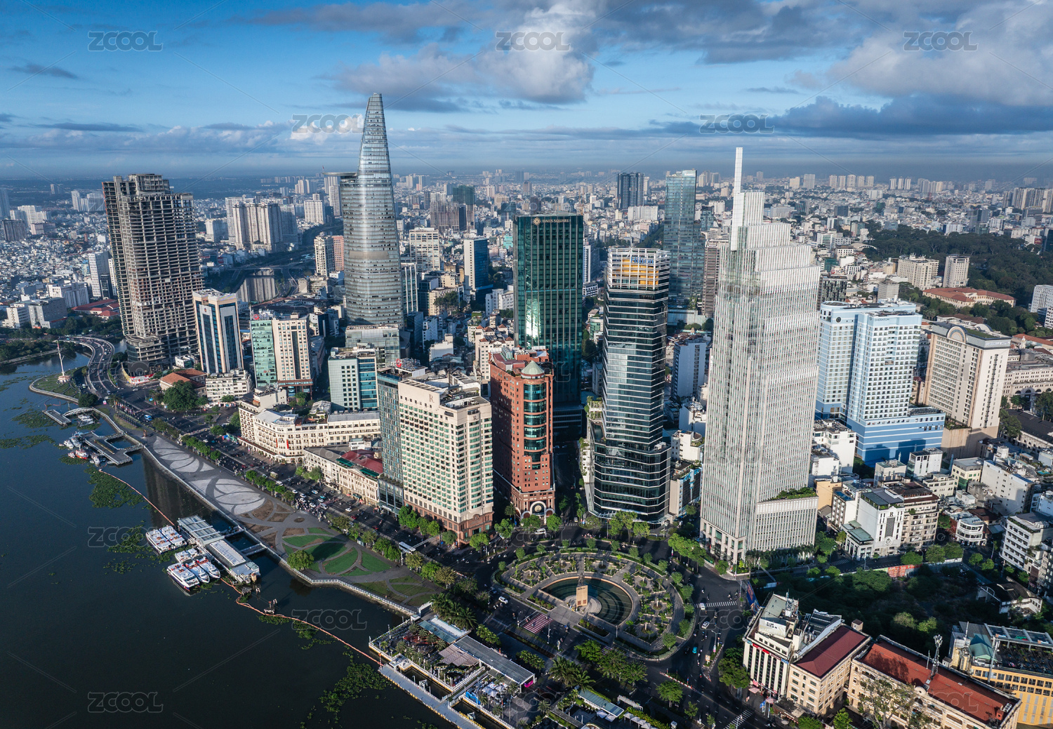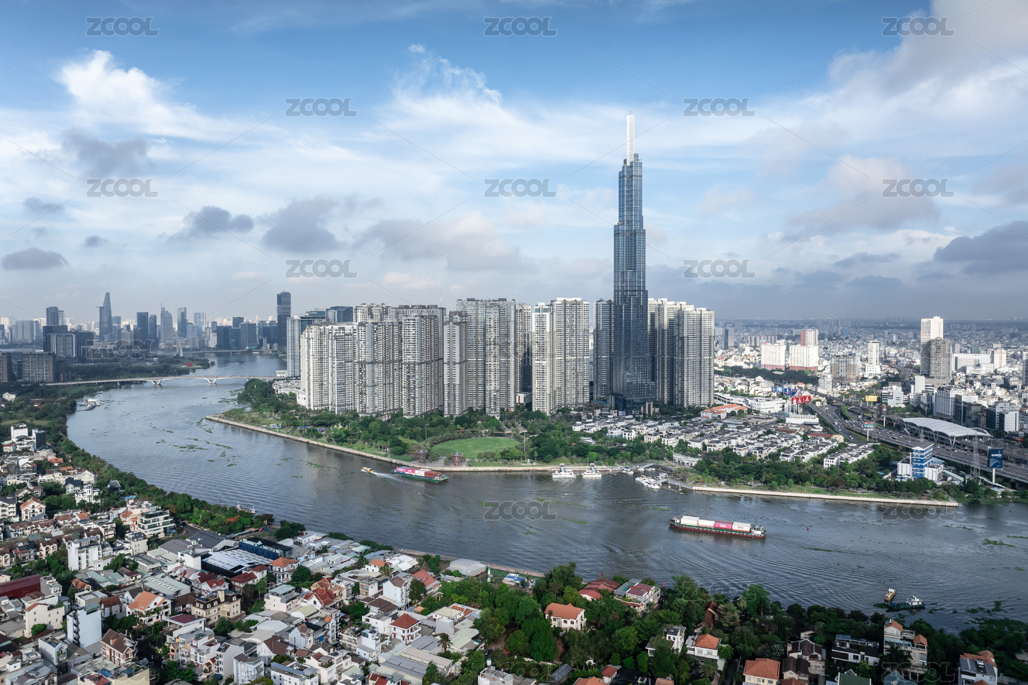 越南胡志明市西贡河城市高楼天际线风光航拍