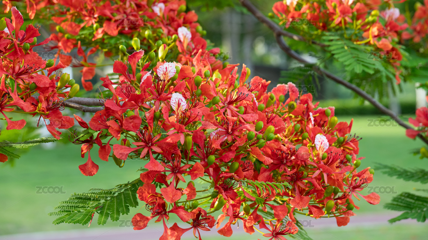 枝头绽放的红色凤凰花花朵