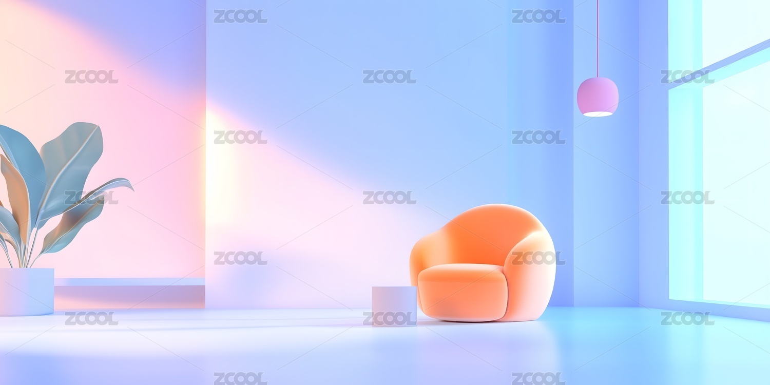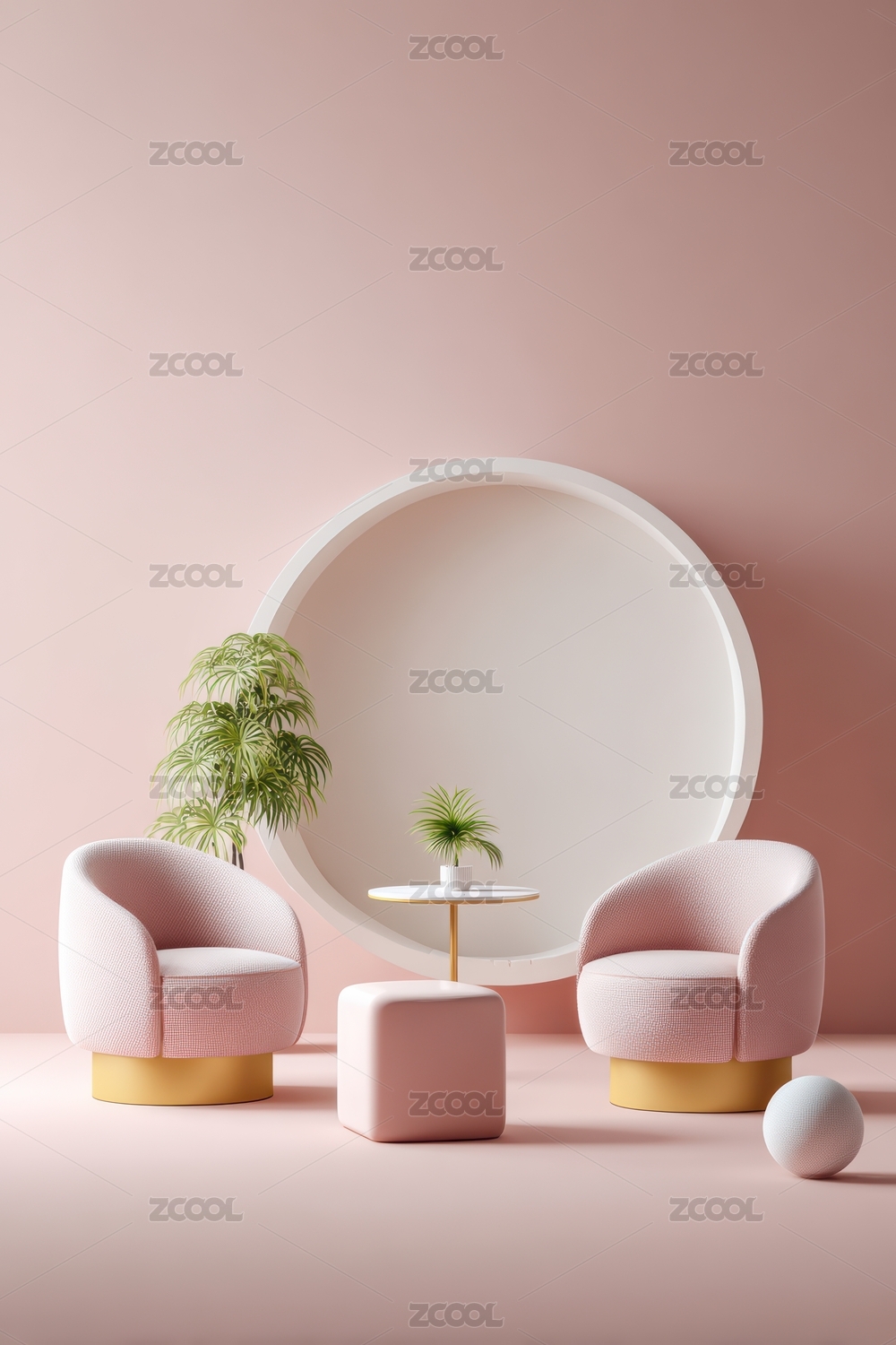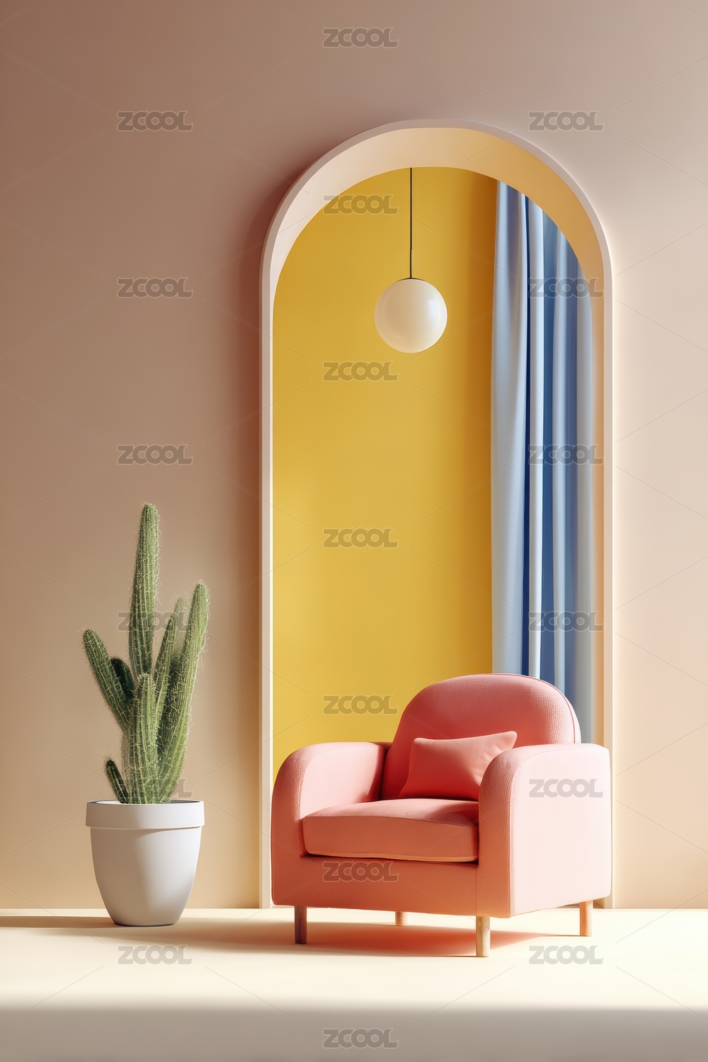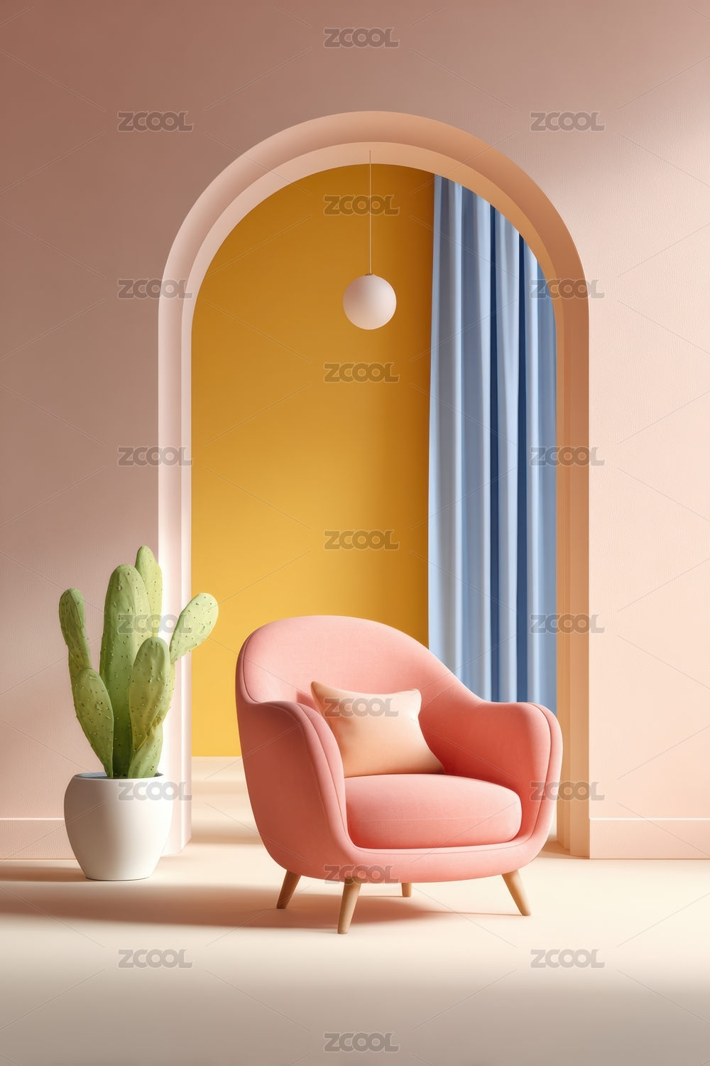 粉色拱门内单人椅与仙人掌 阳光洒入
