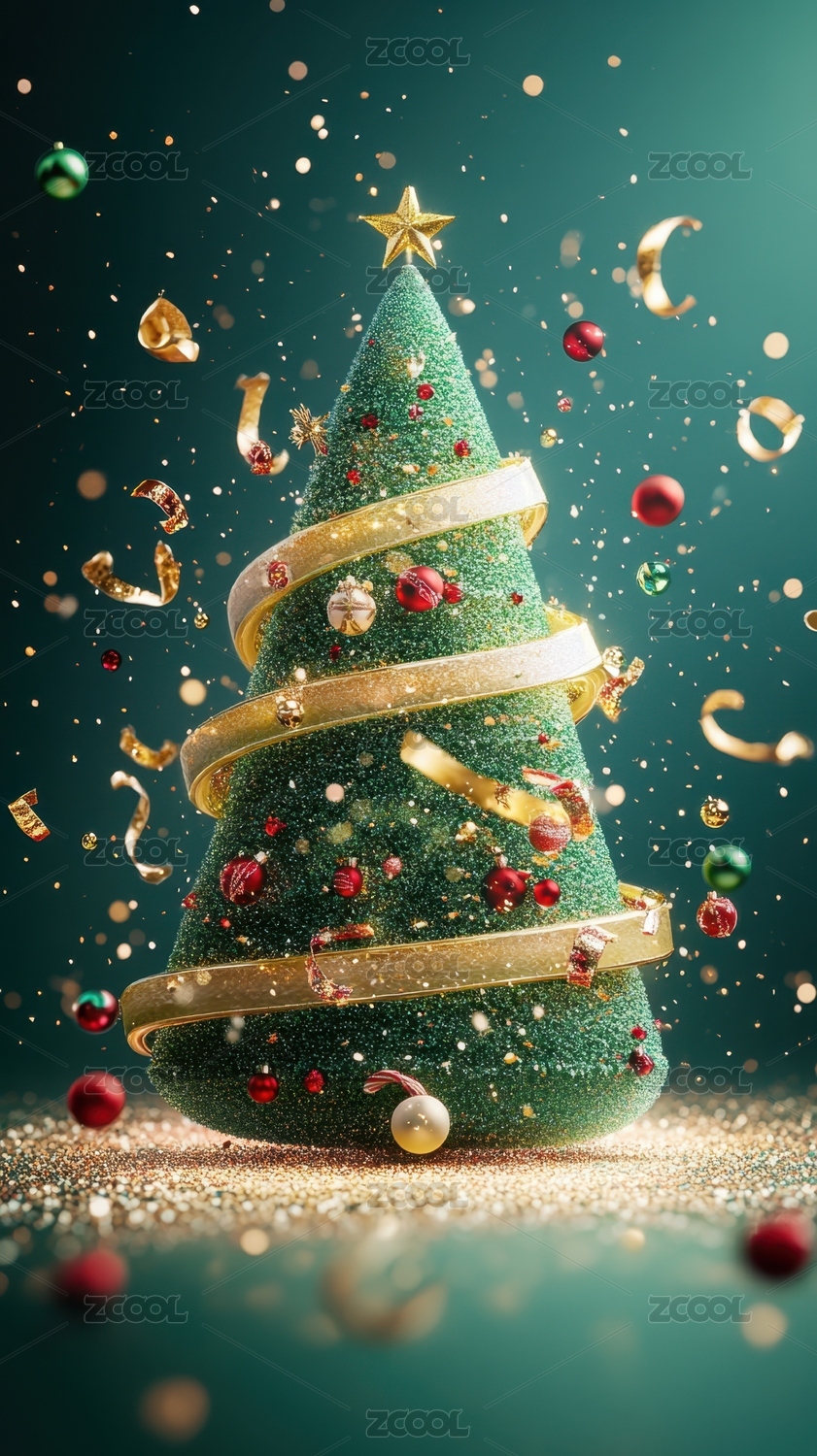绿色和金色丝带交叉螺旋交叠的圣诞树