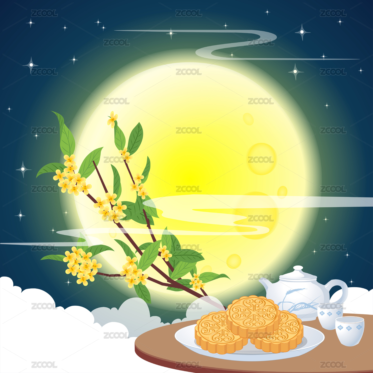 中国传统节日中秋节月亮月饼茶壶茶杯插画