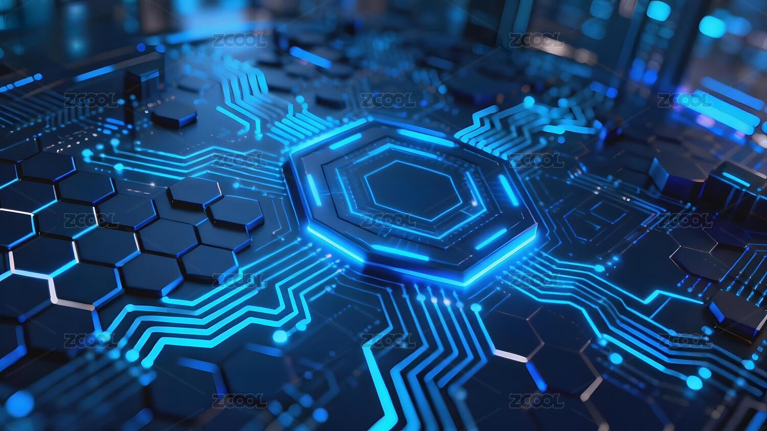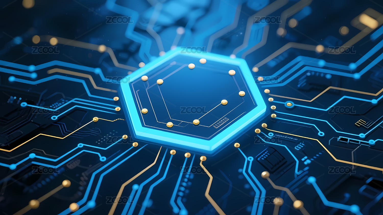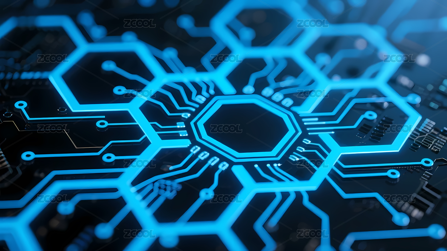 控制论,电路板,概念艺术,六边形处理器,电蓝色,几何排列,未来感,商业项目