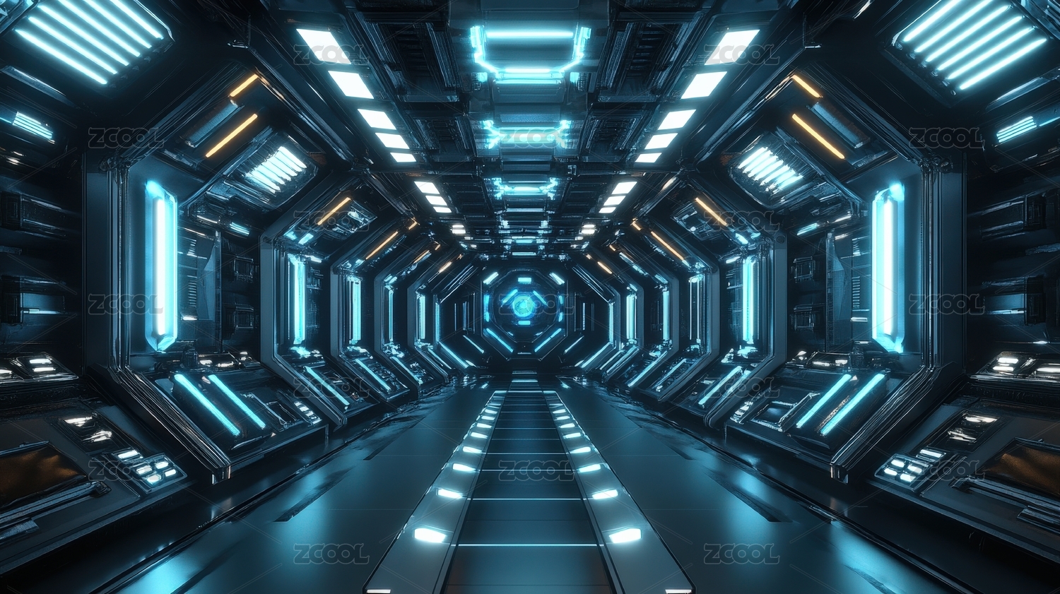 隧道,科幻,未来,光影,场景,插画,科技感,蓝色,金属,空间