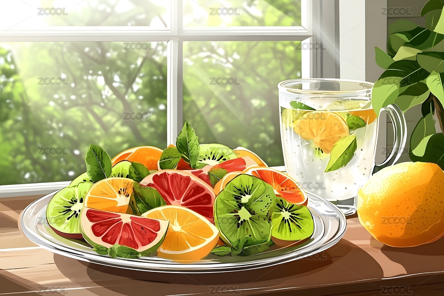 自然光下的水果沙拉与鲜柠檬水