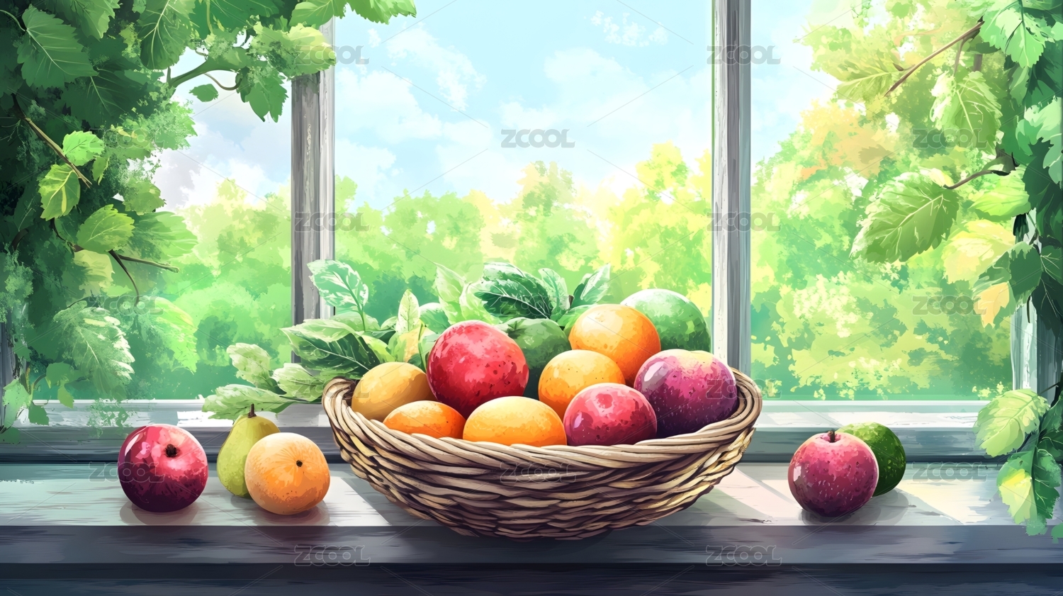 窗台上手工编织筐中的新鲜水果