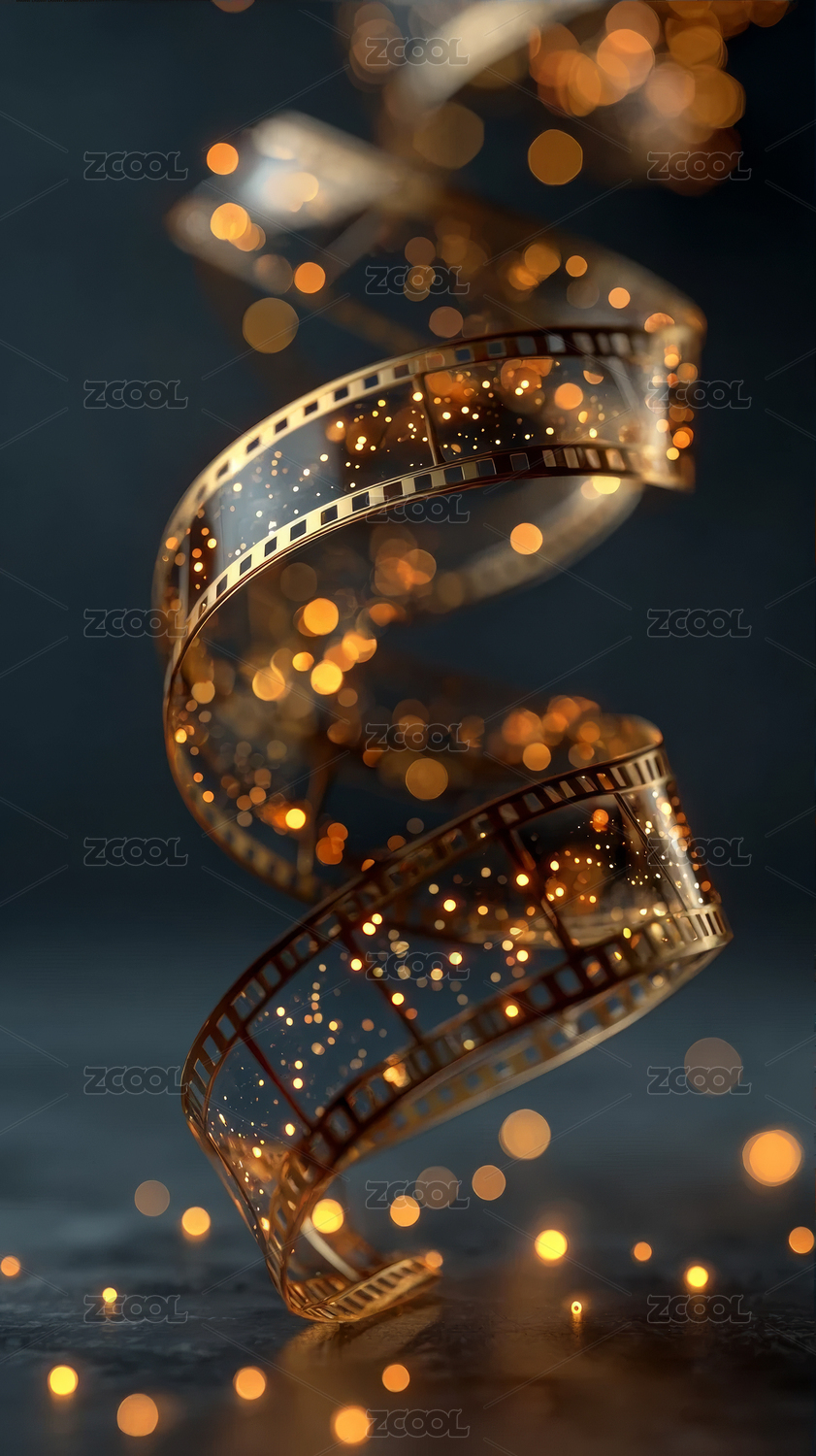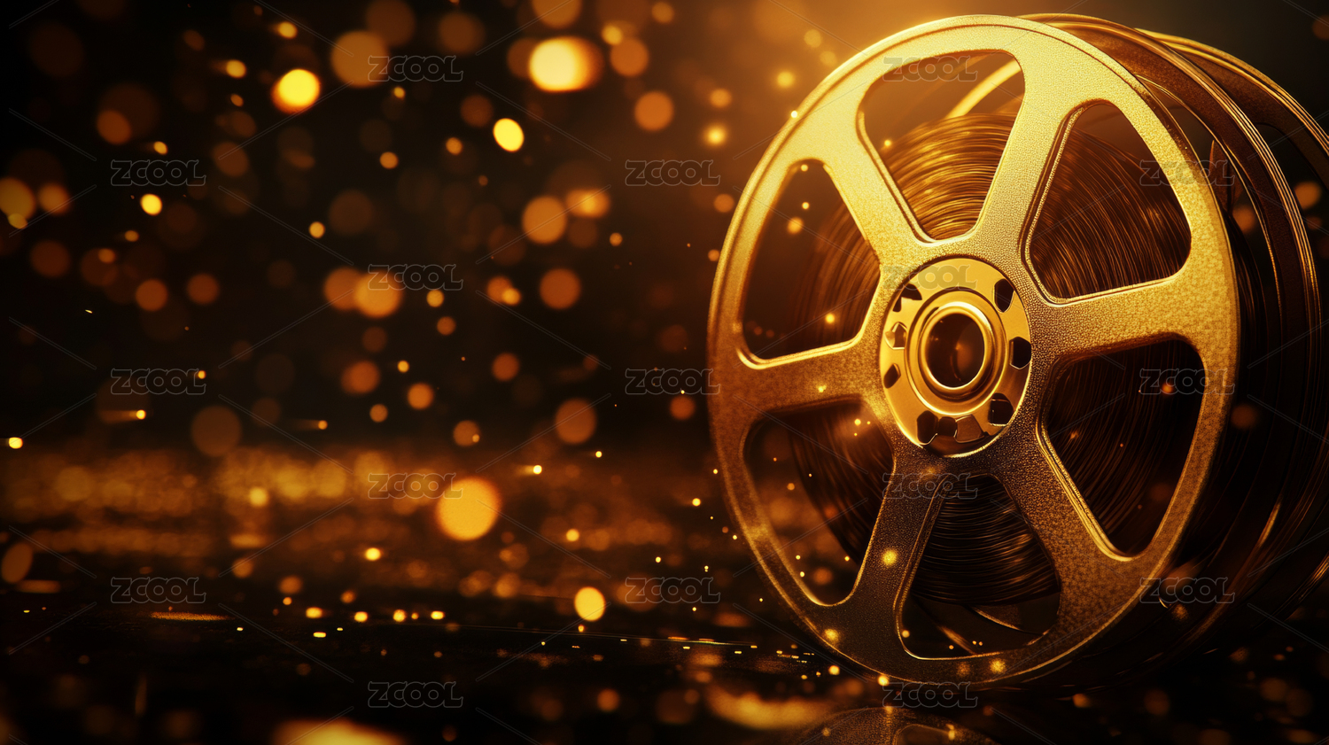 一堆金色的硬币和胶卷背景是模糊的金色光斑