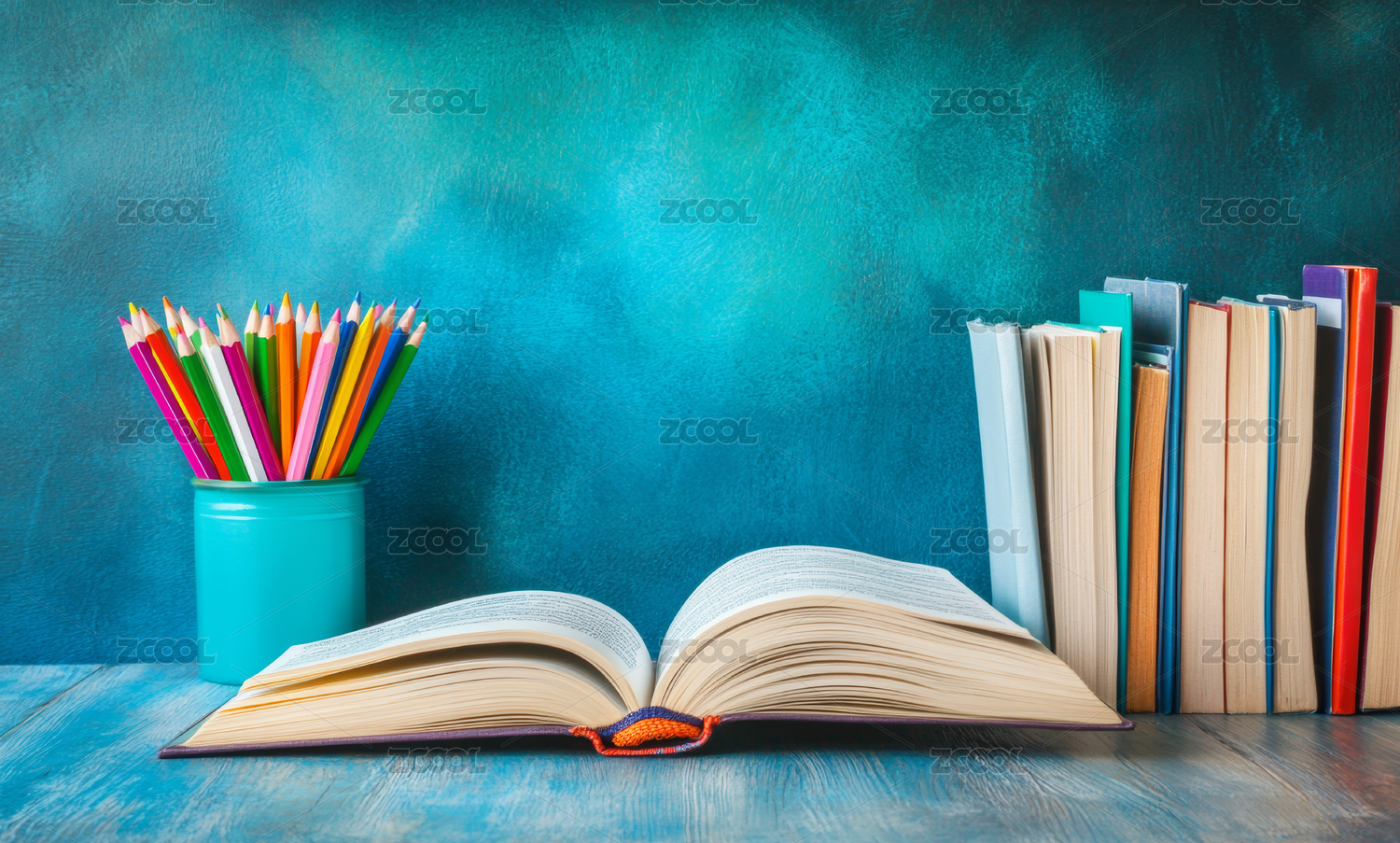 叠起的书籍笔筒铅笔学生文具,教育主题背景