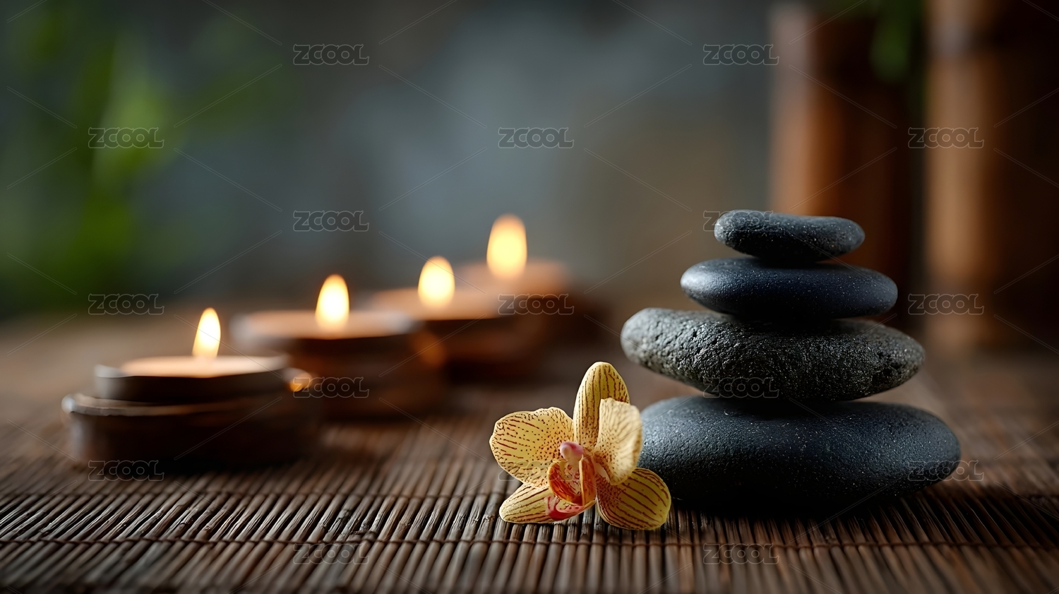 绿色,植物,黑色,点燃,紫色,前景,水面,蜡烛,鹅卵石,小花