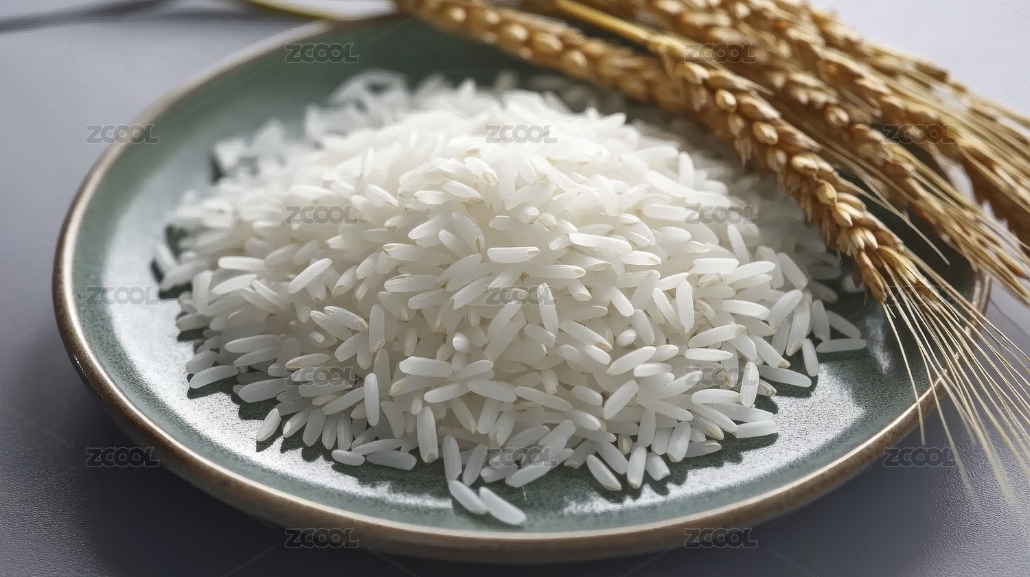 装饰,白米饭,碗,木勺,麦穗,木质,桌面,白色,棕色,食物