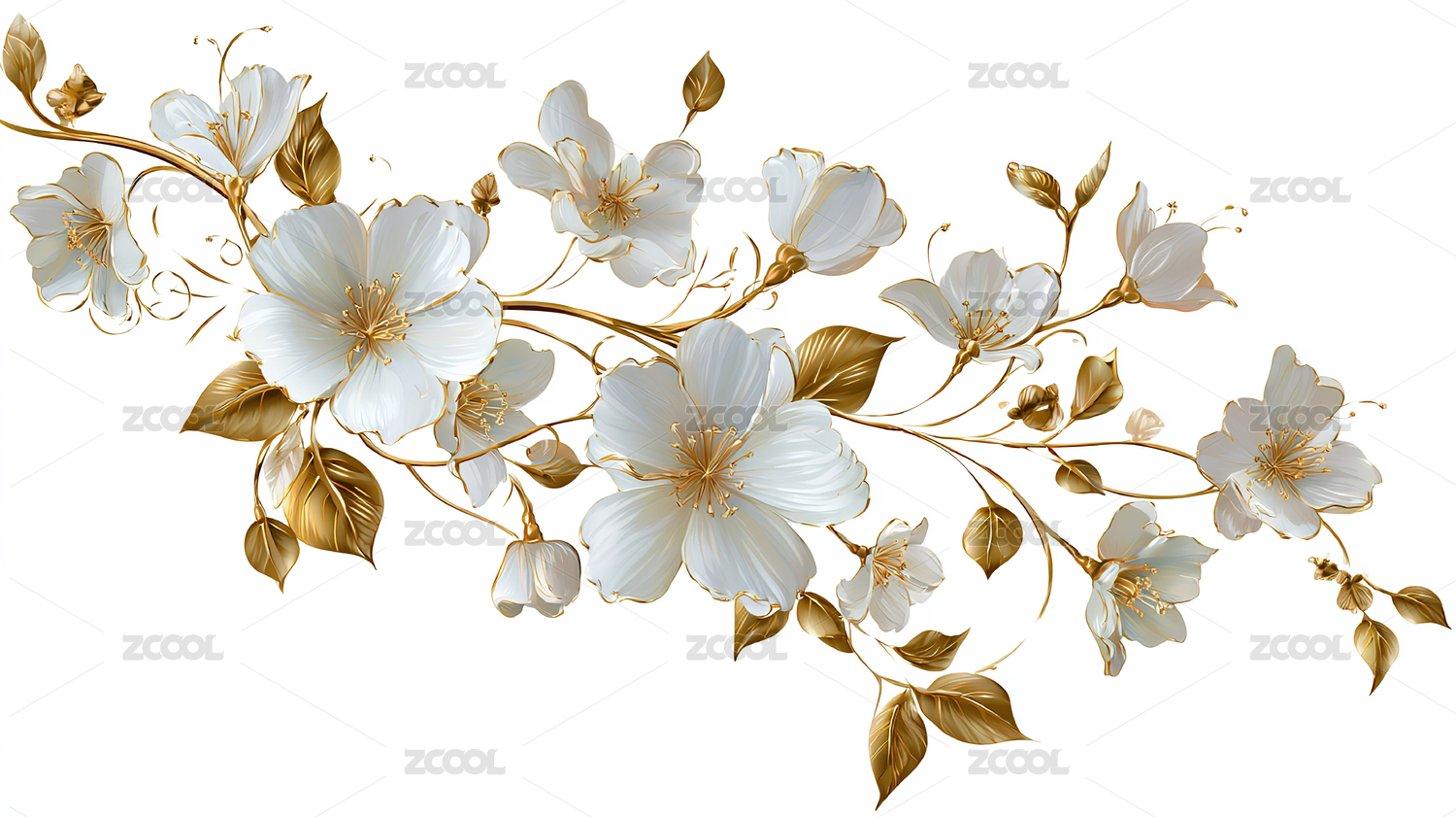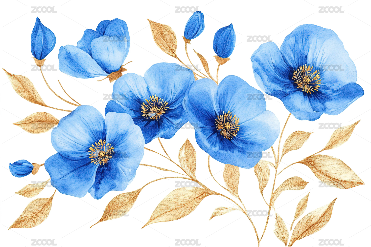 蓝花金叶的唯美花卉图案