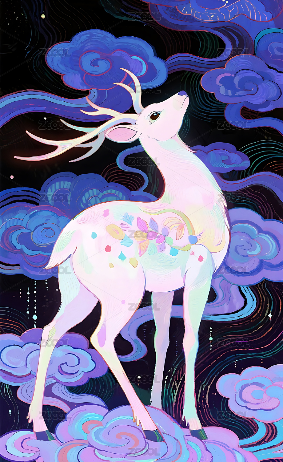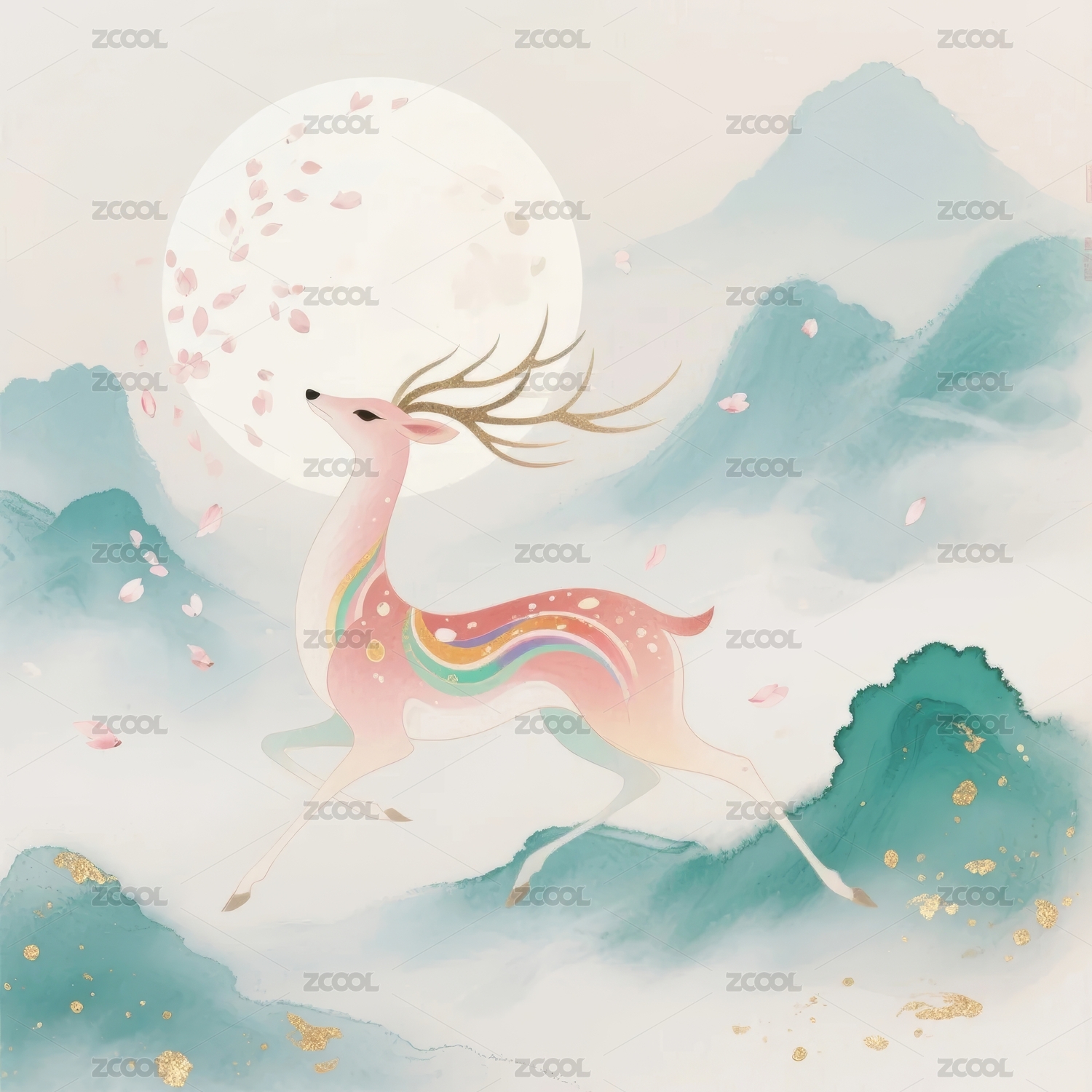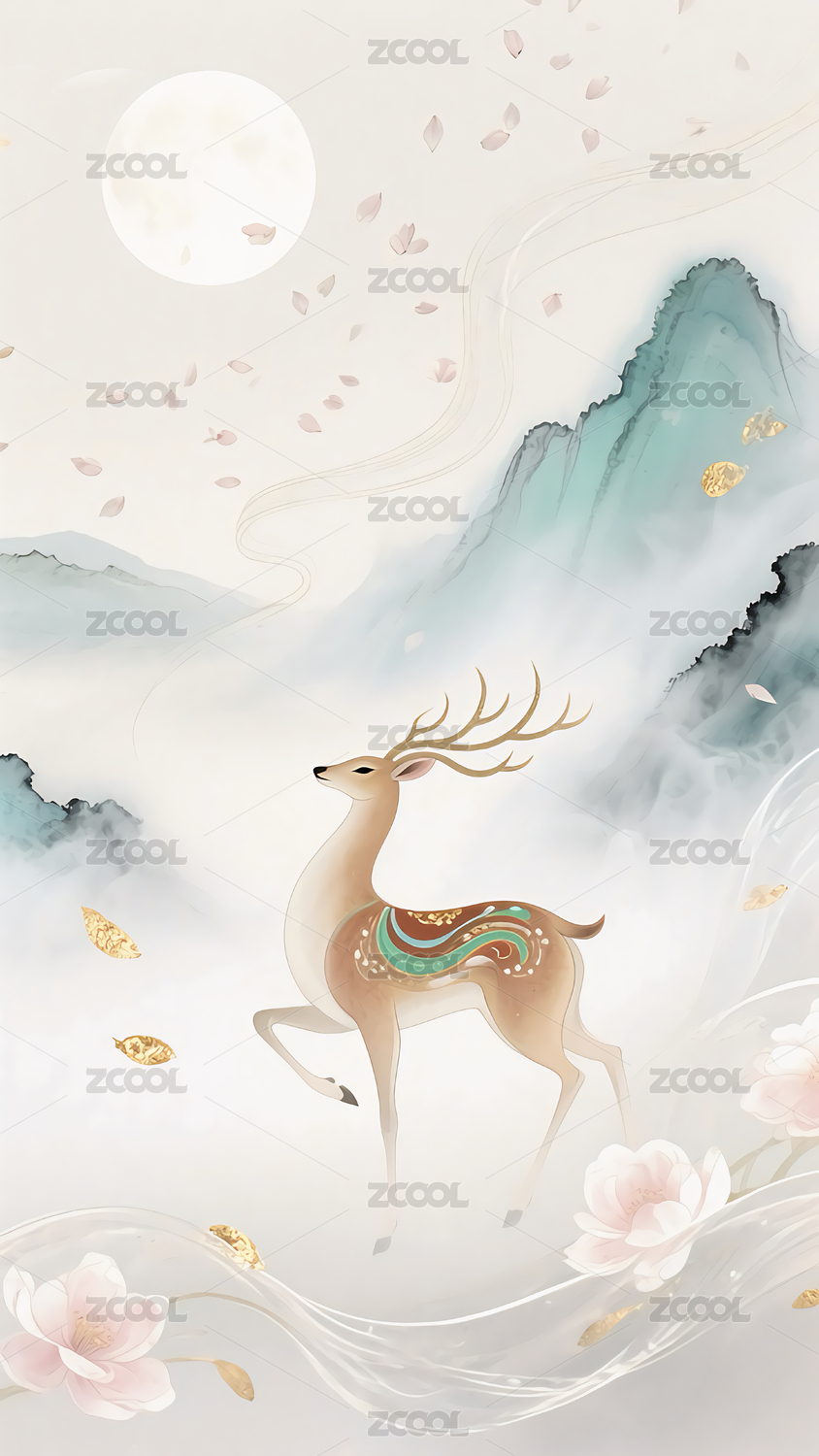 水墨画,九色鹿,背景,壁纸,神兽,奇幻,山海经,花朵,节日,满月