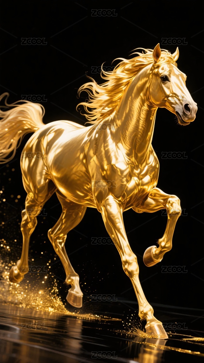 金色马,骏马,奔跑,水花,插画,动物,动态,华丽,金属质感,艺术