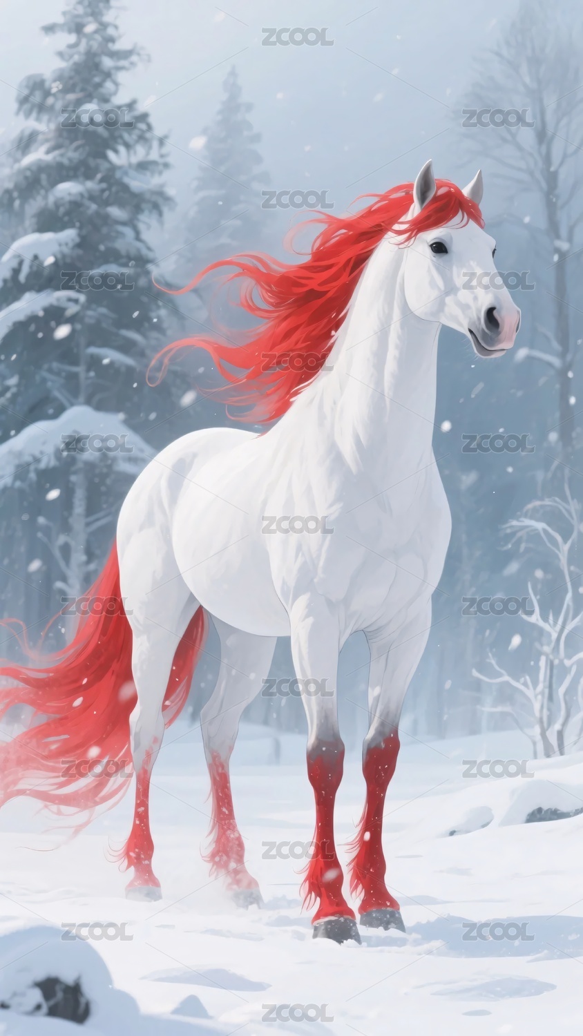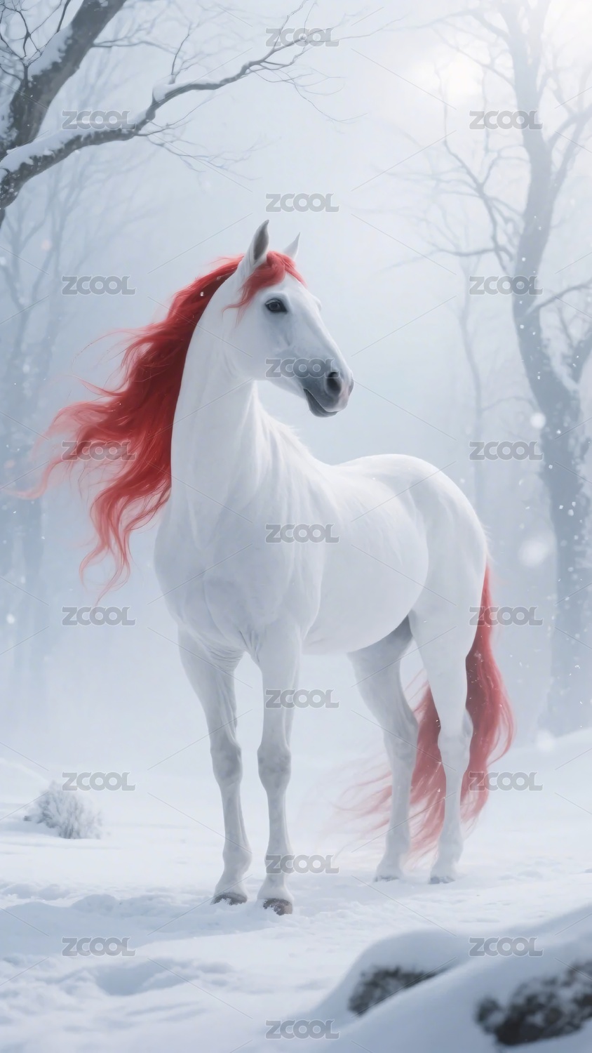 雪地中红鬃白毛的奇幻马匹