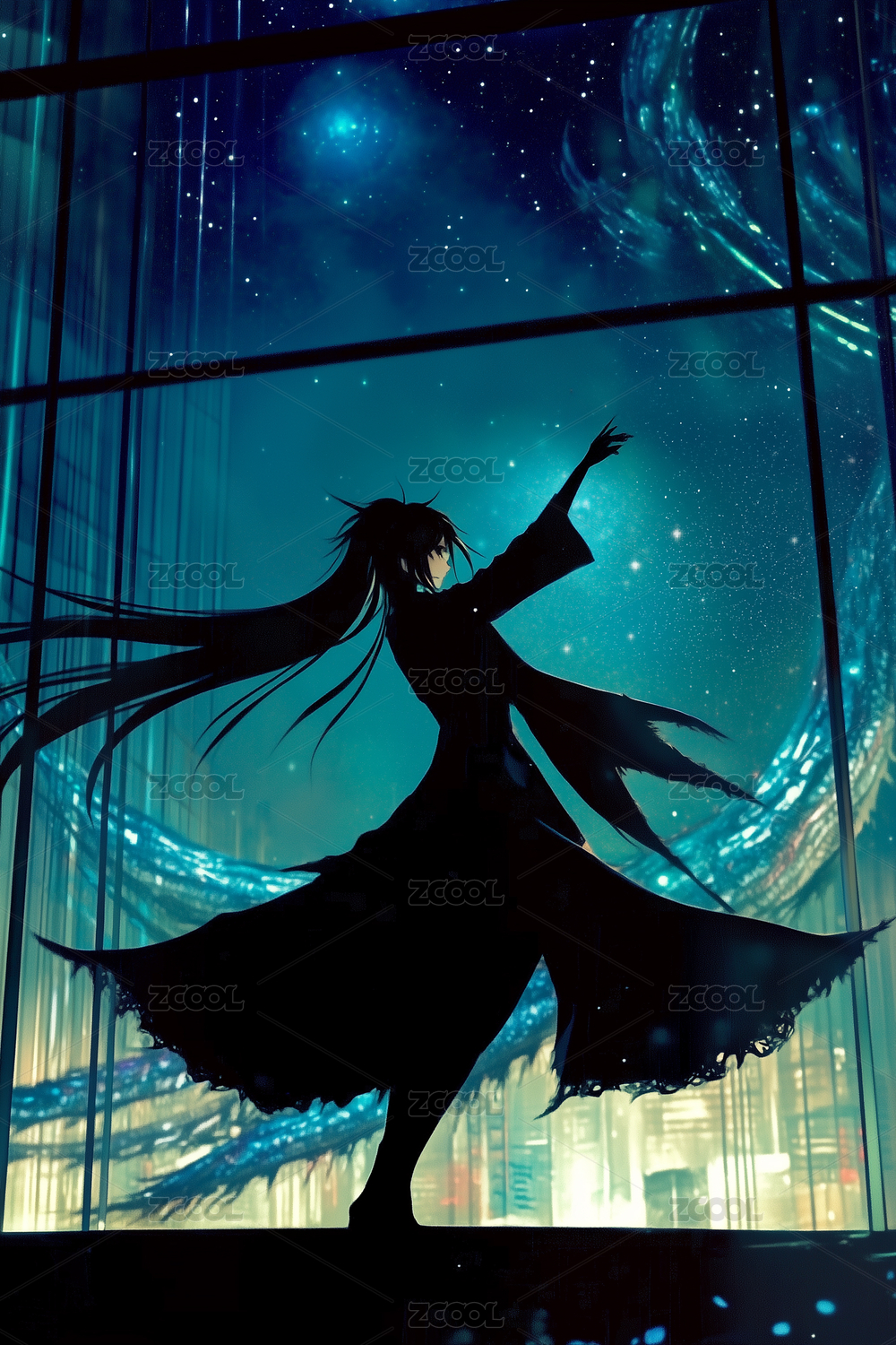 夜空下的长发少女
