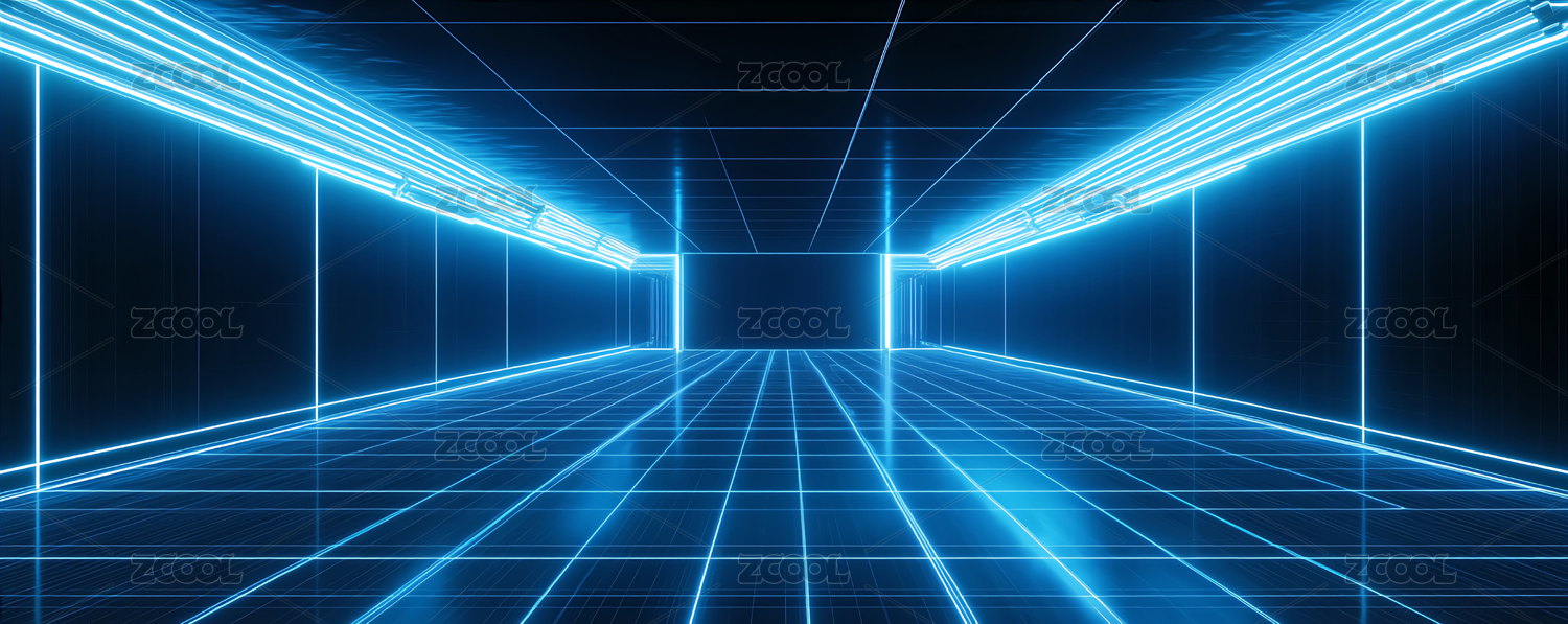 蓝色霓虹灯构成的未来科技走廊