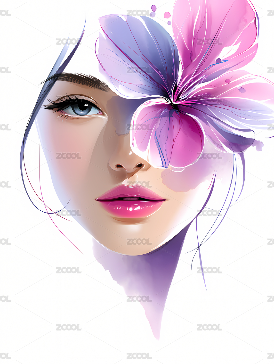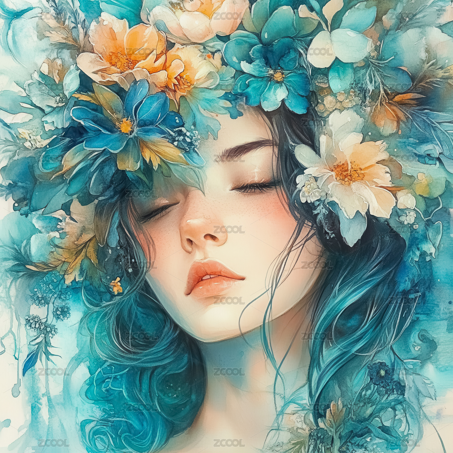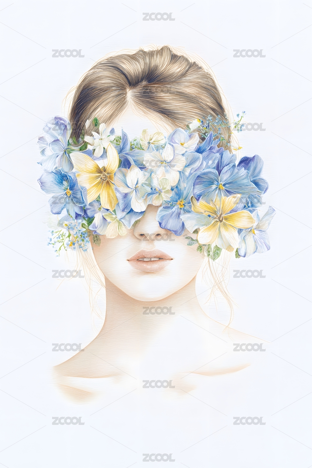 花瓣女子头饰唯美肖像 蓝黄花卉氛围