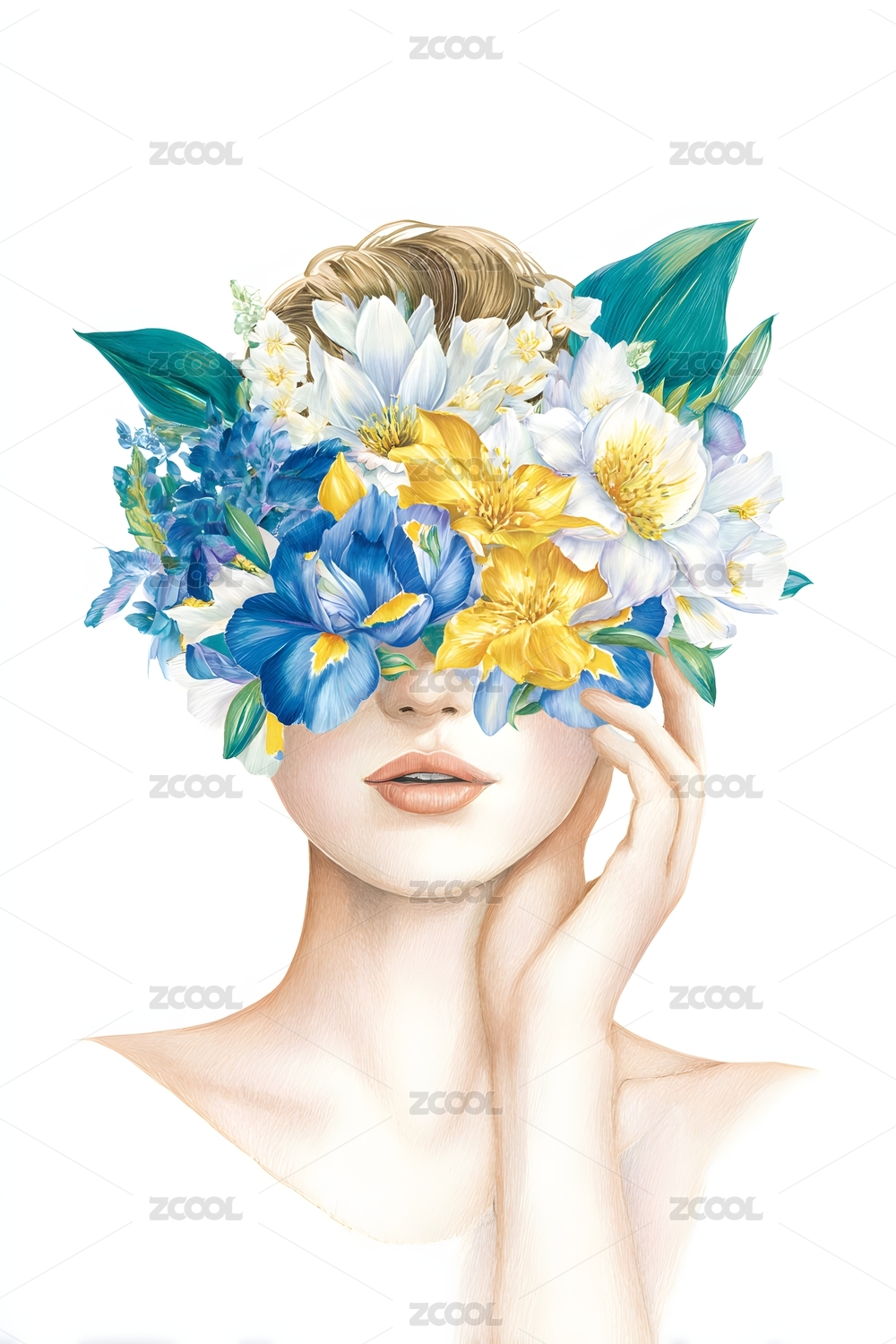 戴花面具的女子 蓝色与黄色花卉艺术写真