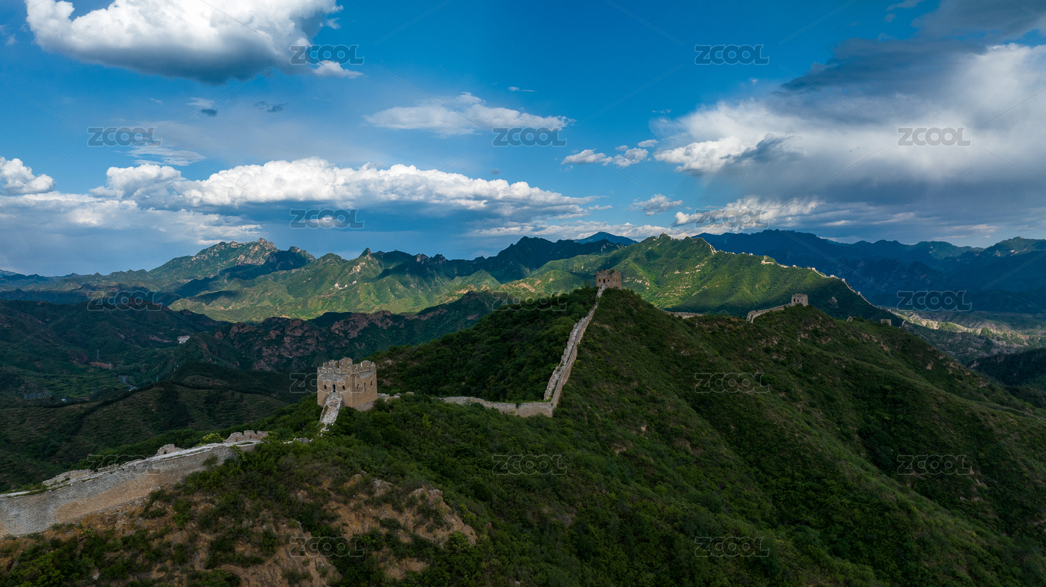 蓝天白云下的中国长城蜿蜒盘旋丛山峻岭