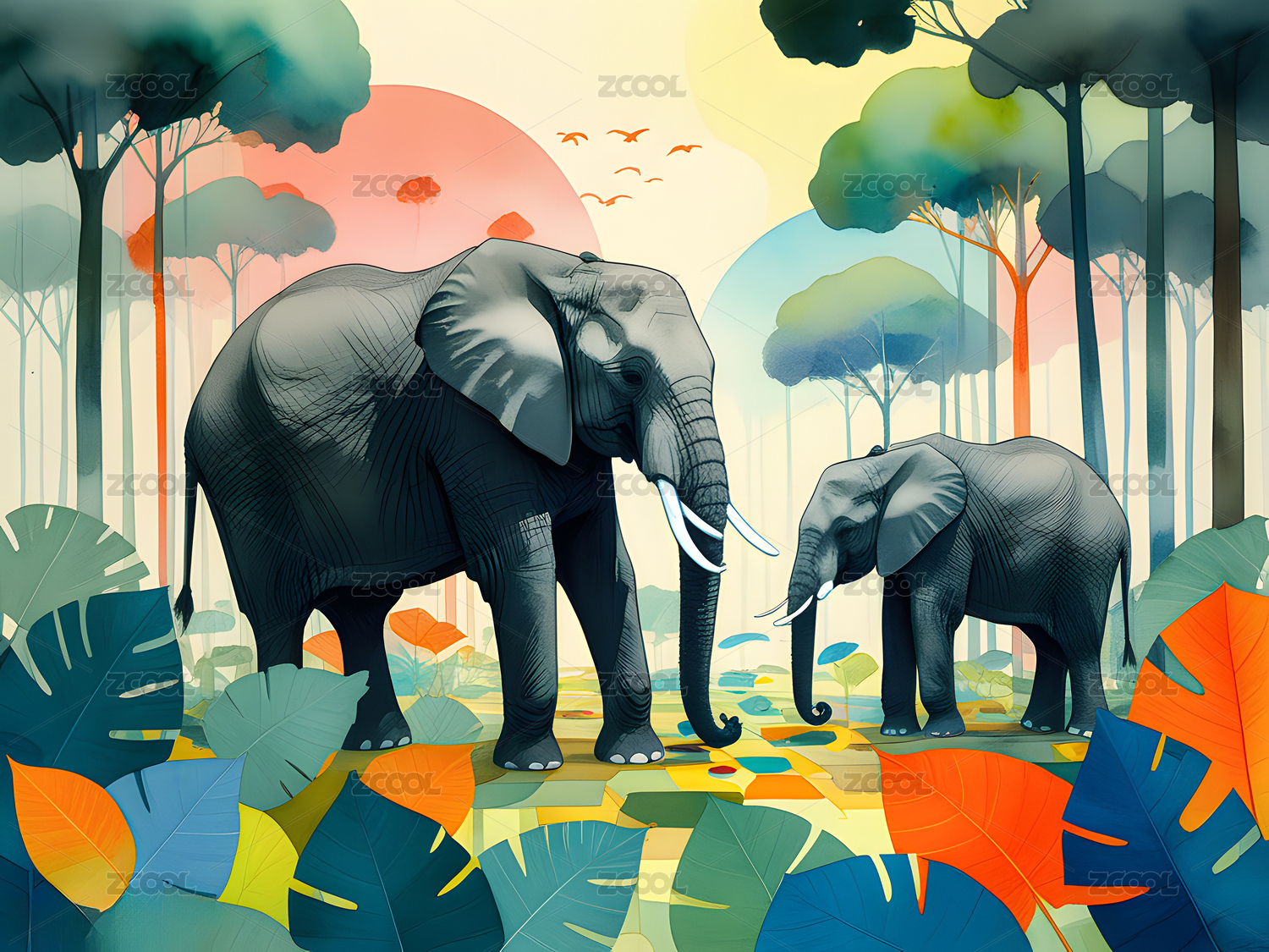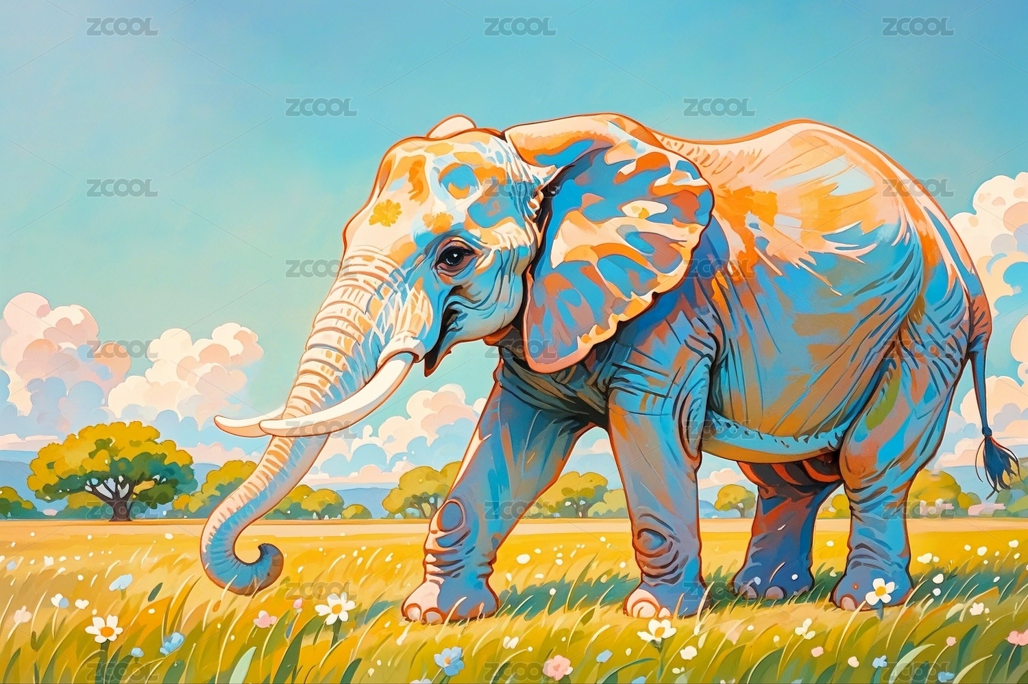 非洲草原大象风景动物油画世界油画风景油画印象派油画