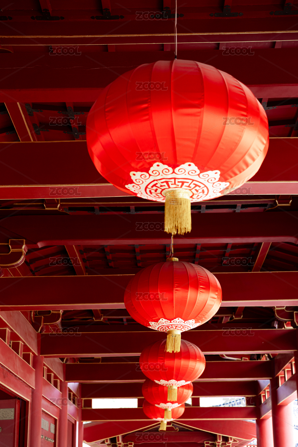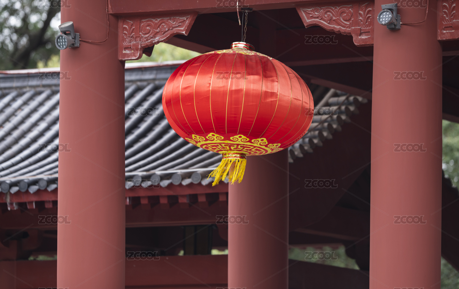 中式飞檐斗拱式木结构建筑上挂着红色灯笼