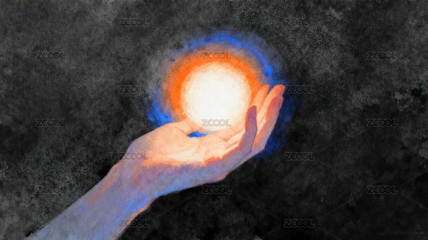 手托带橙蓝光晕的光球