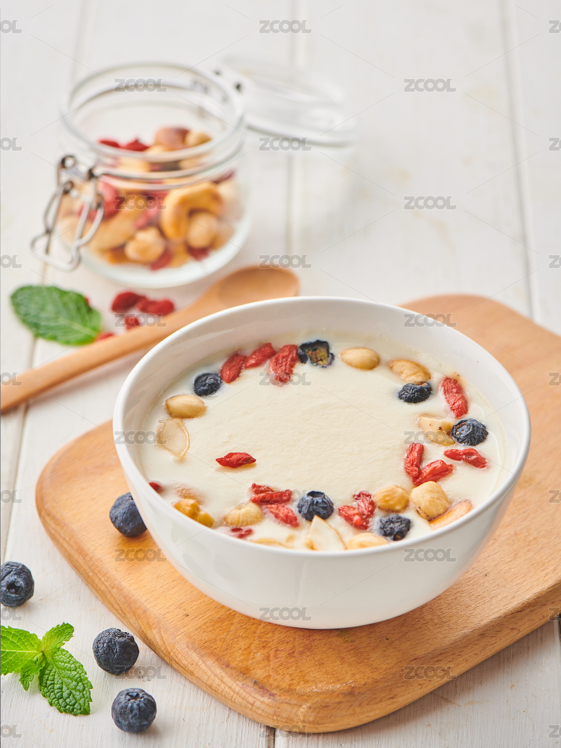 放在原木桌上的一碗新鲜果干坚果酸奶特写