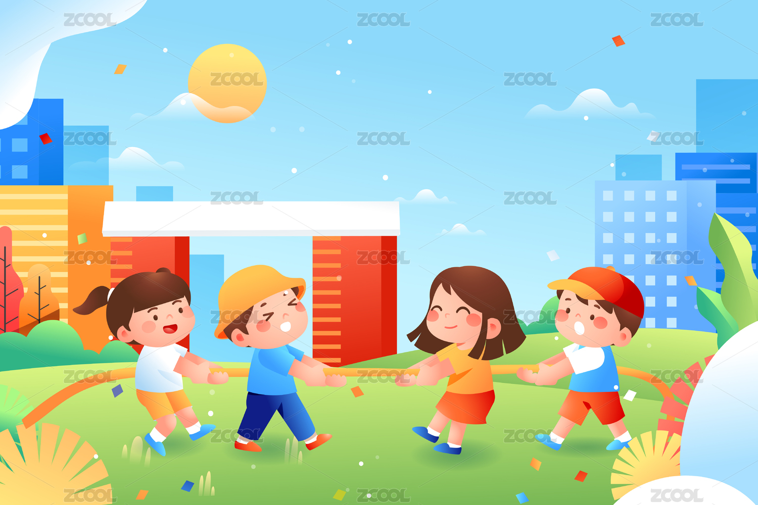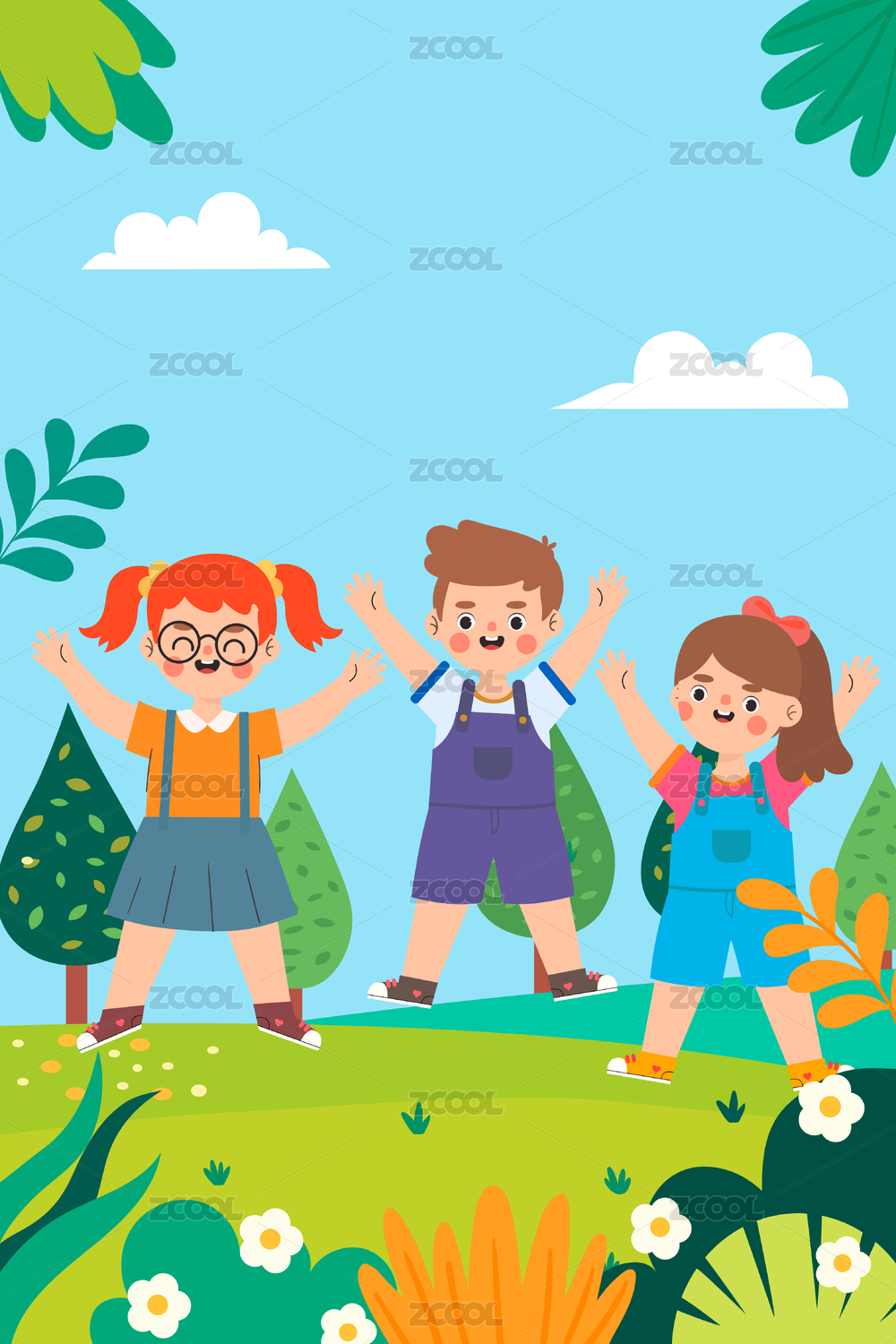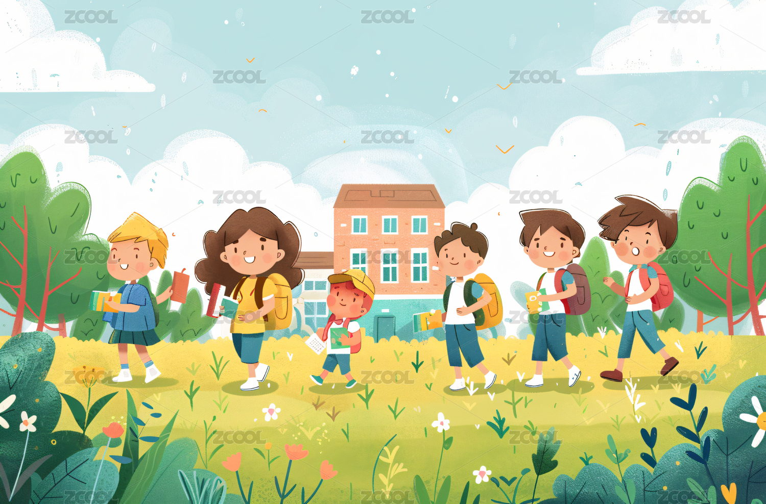矢量插画蓝天学校植物等男孩女孩儿童开学