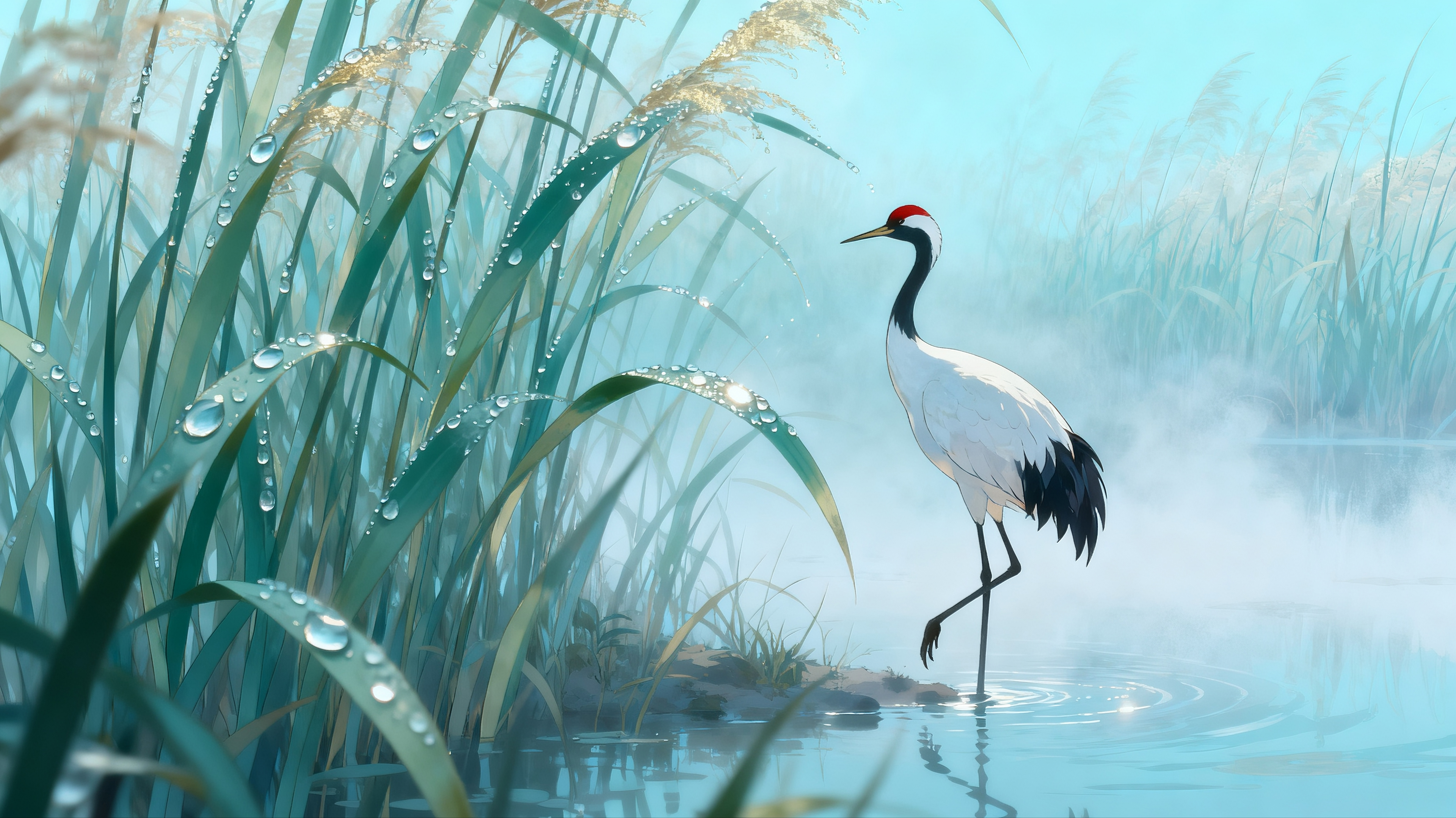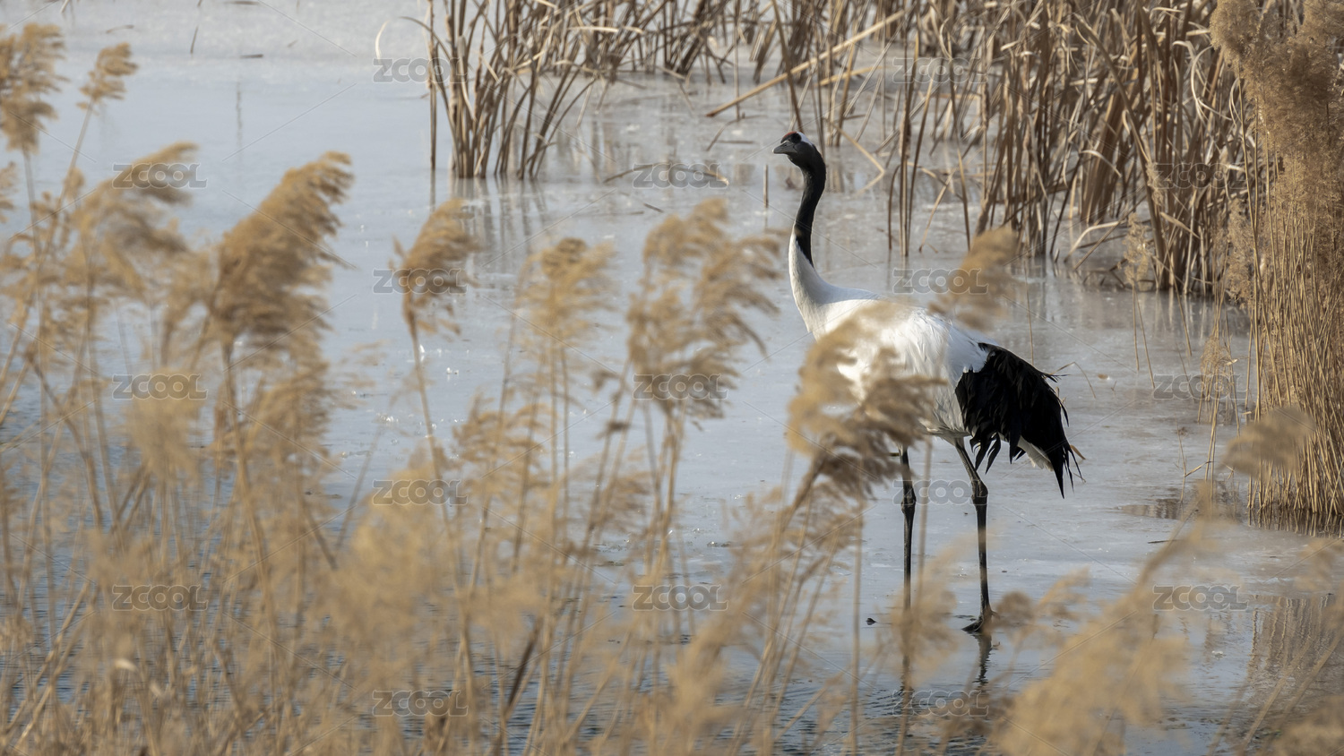 芦苇丛旁的仙鹤国画